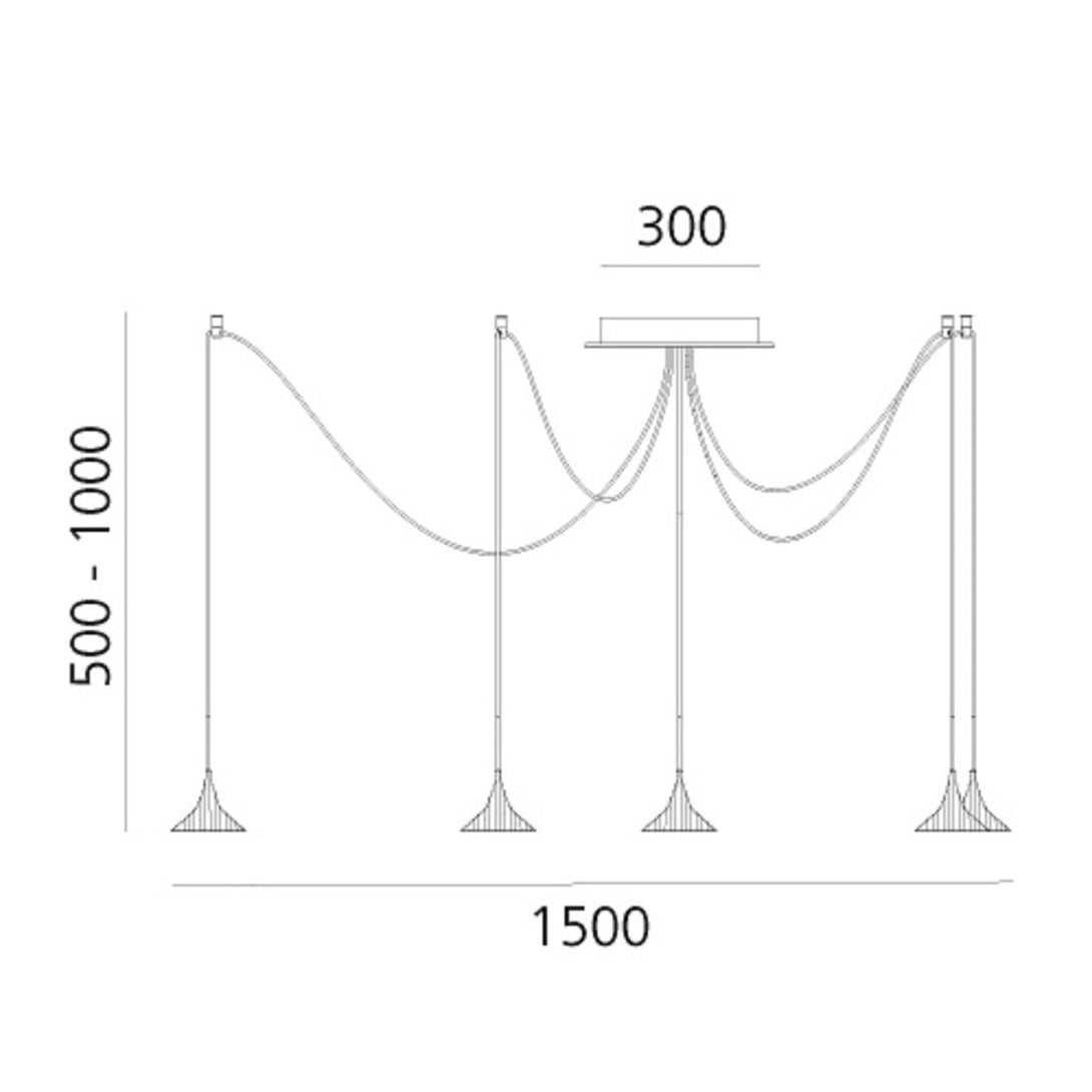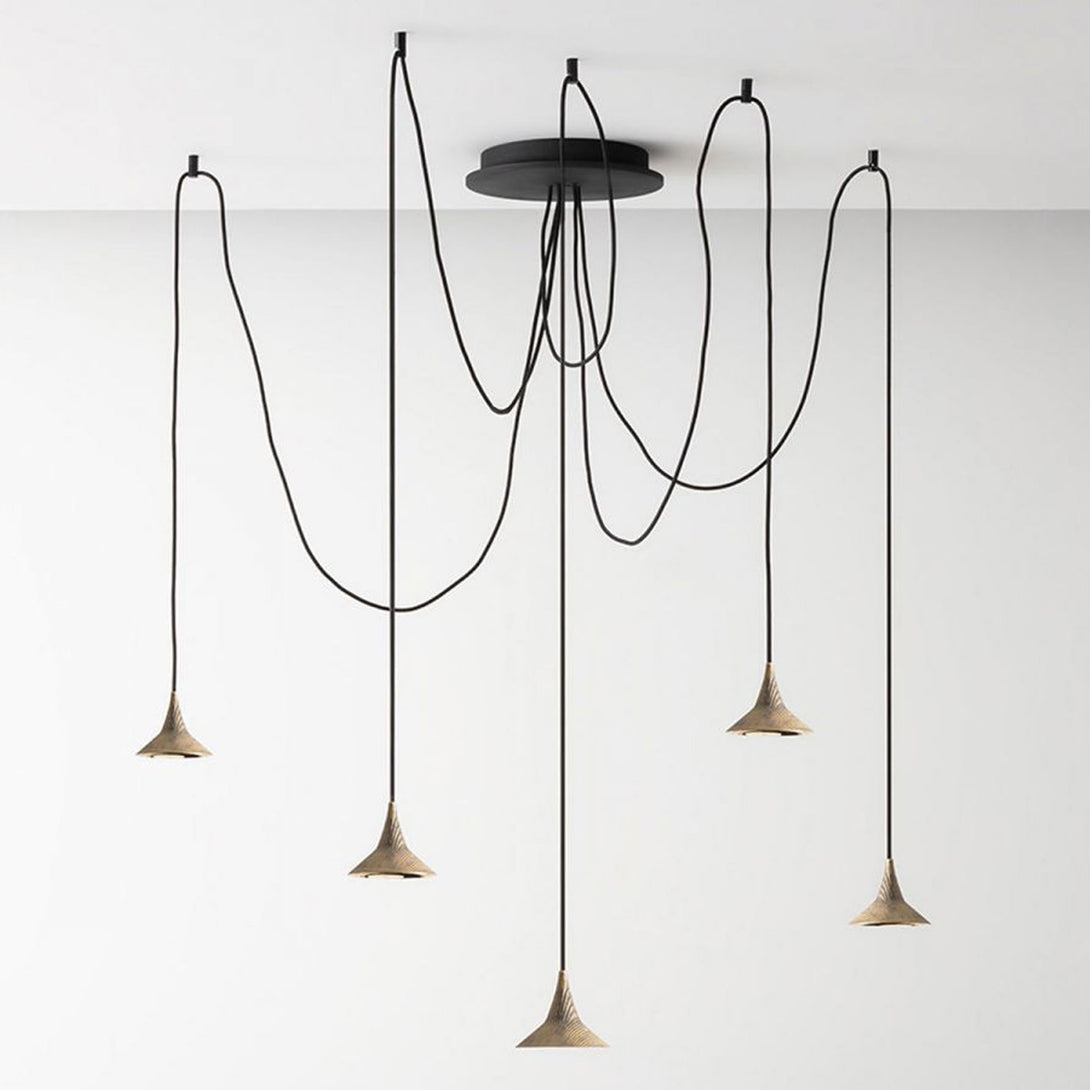 The Unterlinden variants include the chandelier free , with five elements suspended from adjustable cables, and the chandelier ring , with a circular frame that distributes the suspended elements along the perimeter. Wall lamp and floor lamp versions are also available, featuring a counterweight that allows the height of the lighting body to be adjusted. The table lamp is ideal for modern environments, with a tilting stem that allows the light flow to be directed as needed.