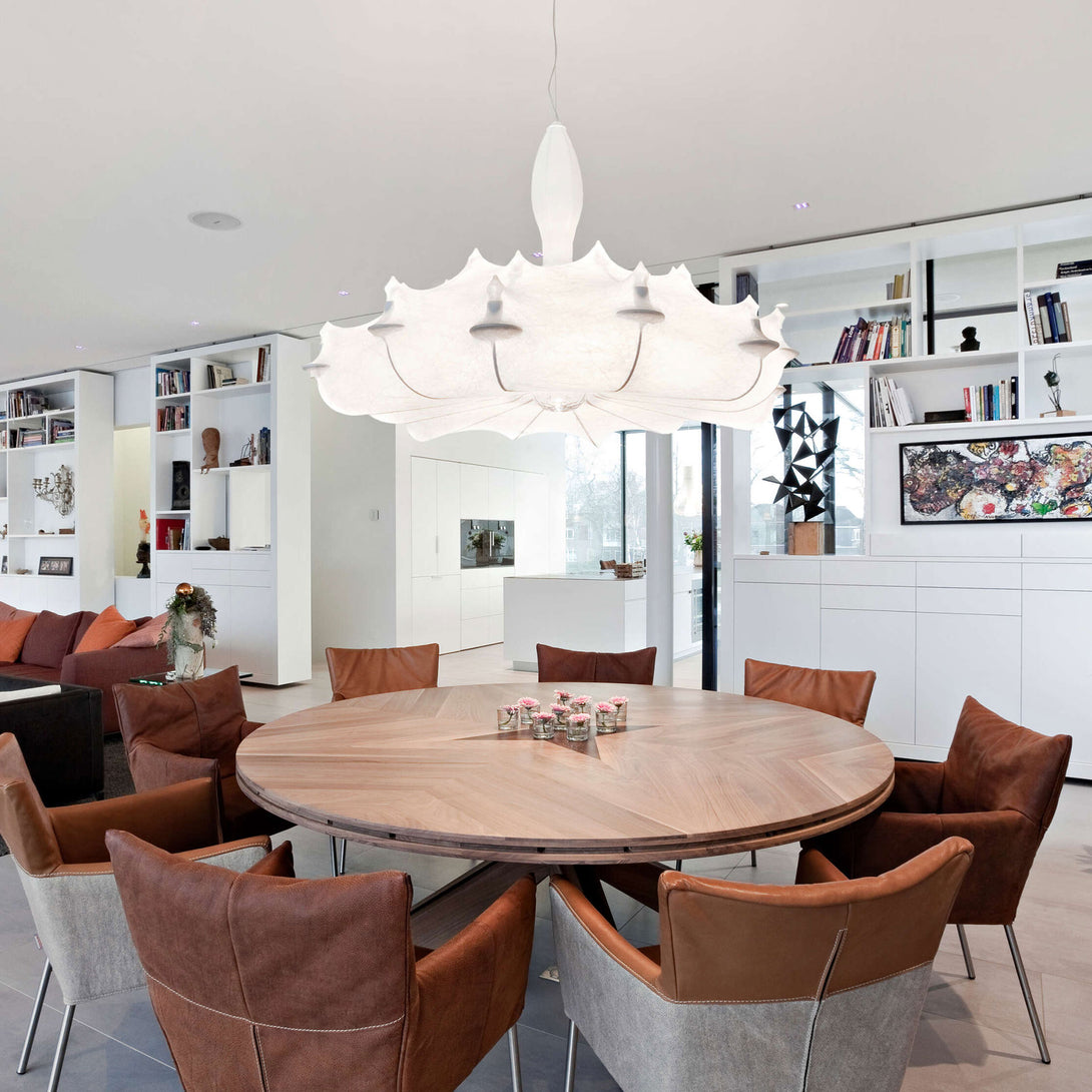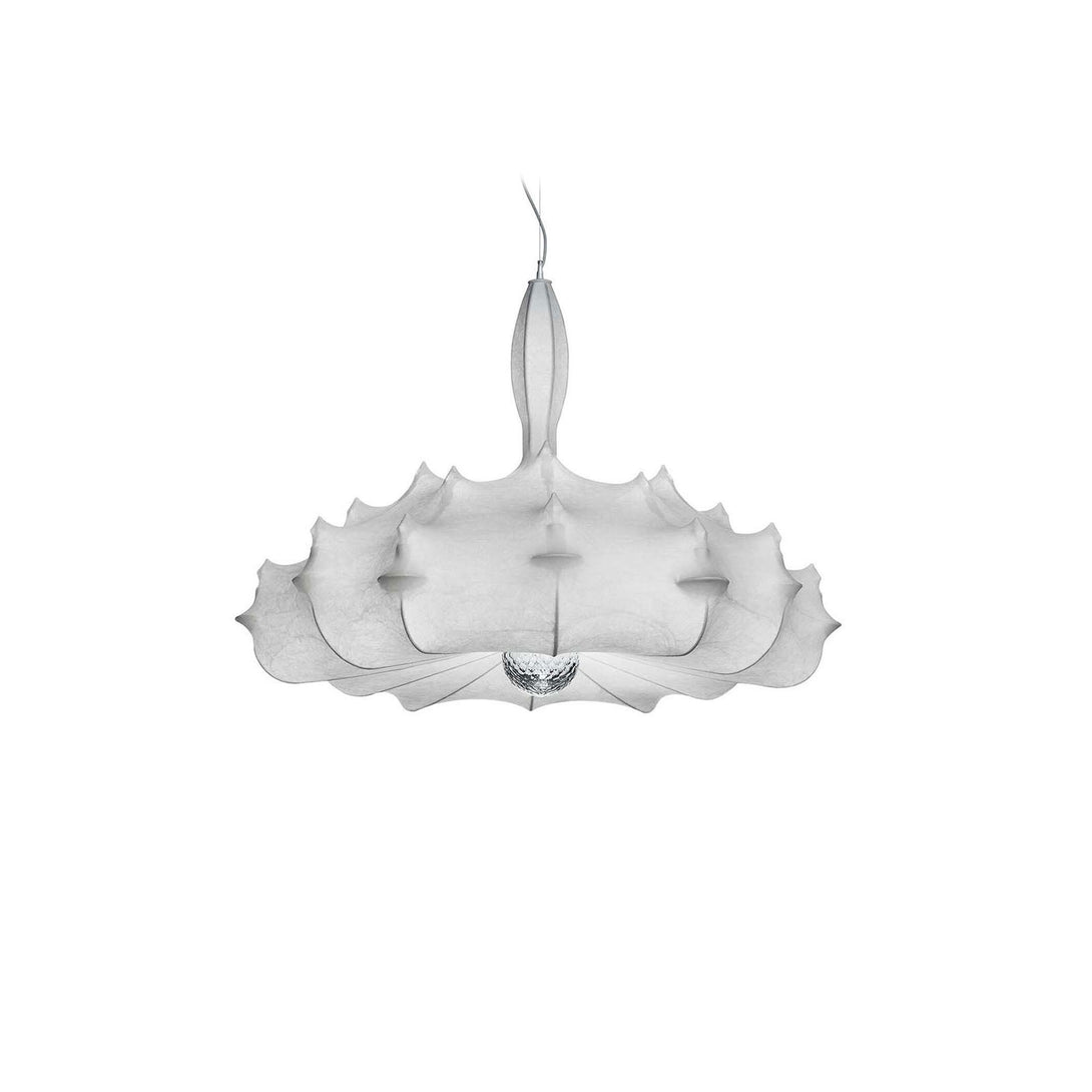The Zeppelin pendant lamp by Flos , designed by Marcel Wanders Studio in 2005, is a visionary reinterpretation of the classic chandelier. Its design surprises and enchants: a white powder-coated steel structure is wrapped in an innovative Cocoon resin coating , expertly sprayed to create a soft, enveloping texture. This luminous "cocoon," completed with a transparent cover, lends a warm, welcoming diffused light to the room, transforming any space into a suggestive and refined haven.