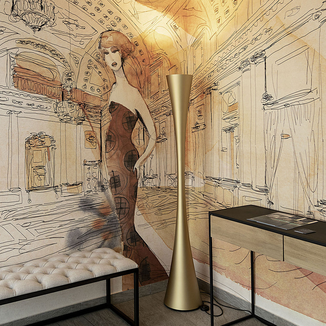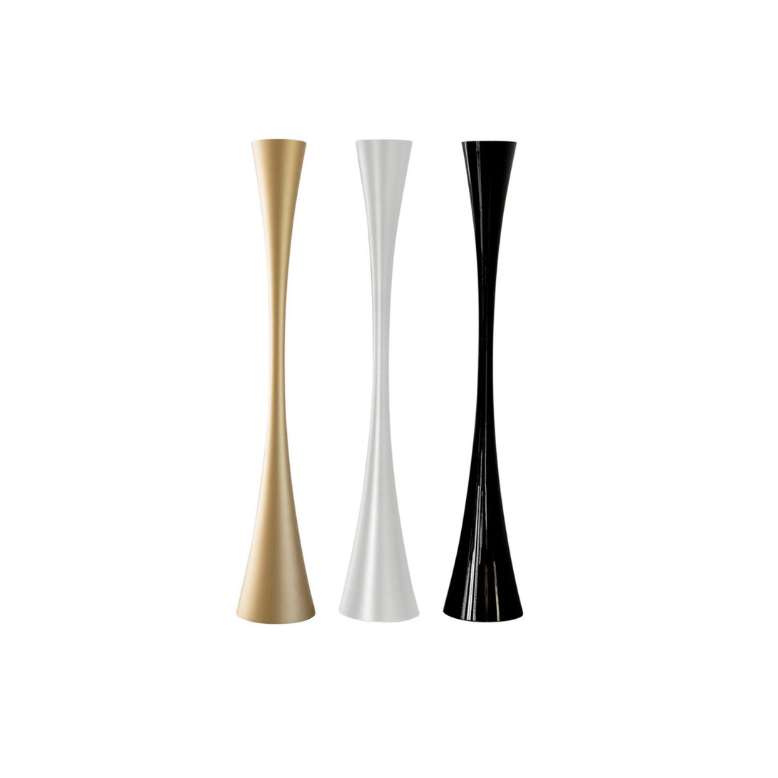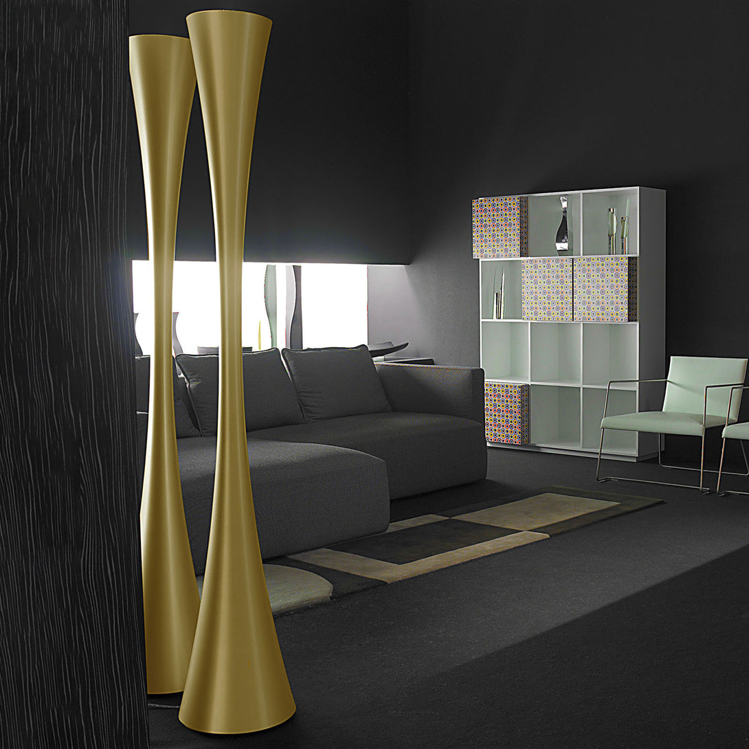 The Biconica floor lamp is made with a plastic frame and a polycarbonate diffuser. Available in glossy black, glossy white, and matte pearl gold finishes, it combines elegance and functionality to enhance any space with style and a discreet presence.