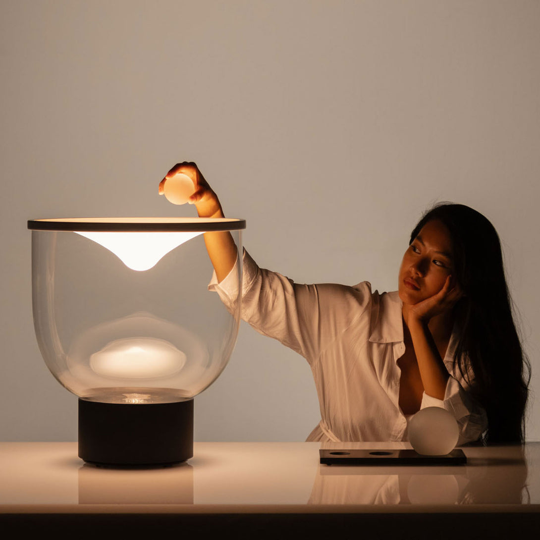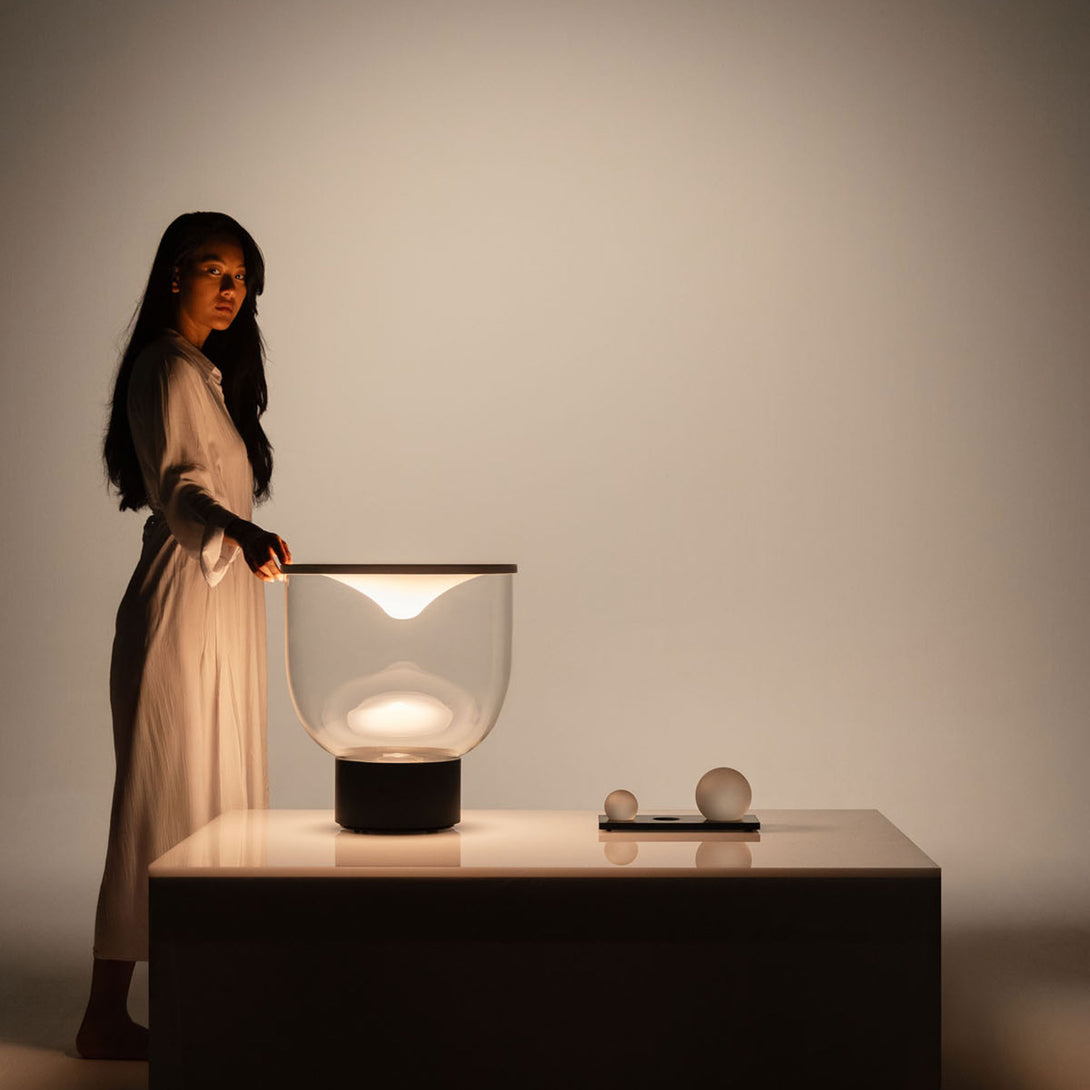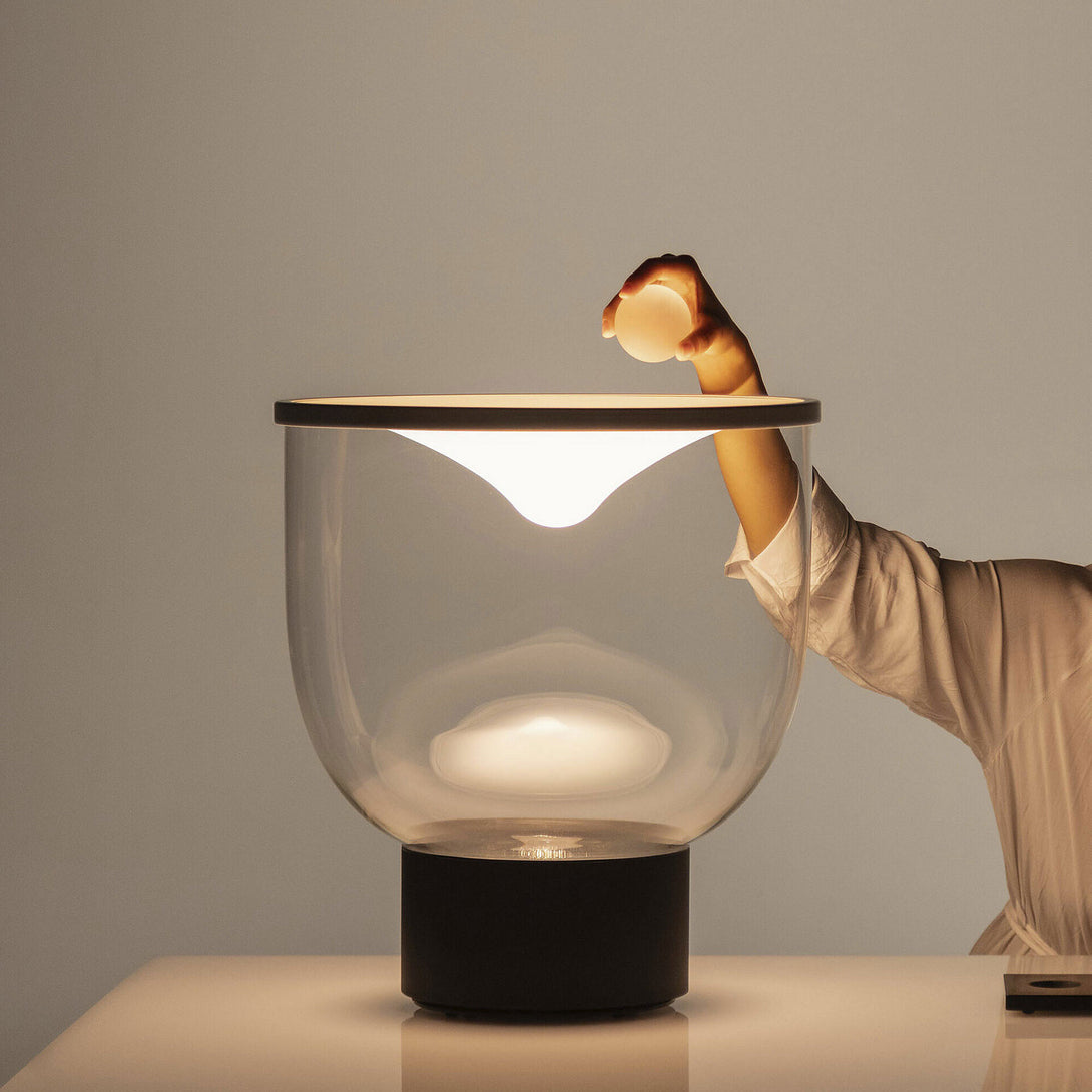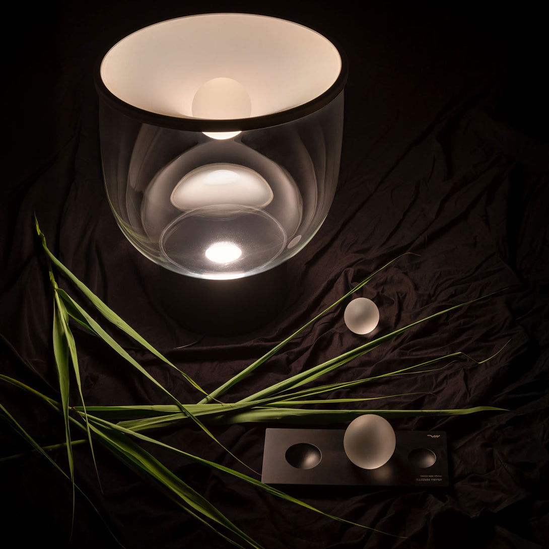Grammoluce is a table lamp , designed by Min Dong of Habits Design for Martinelli Luce , characterised by an upper elastic membrane in Lycra® that covers the borosilicate glass structure, transforming the interaction into a new way to turn on and modulate the light.