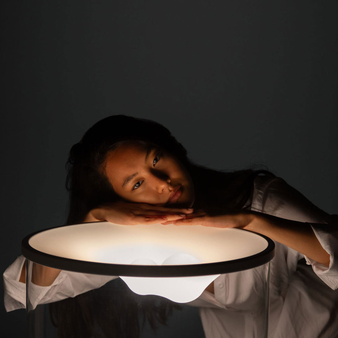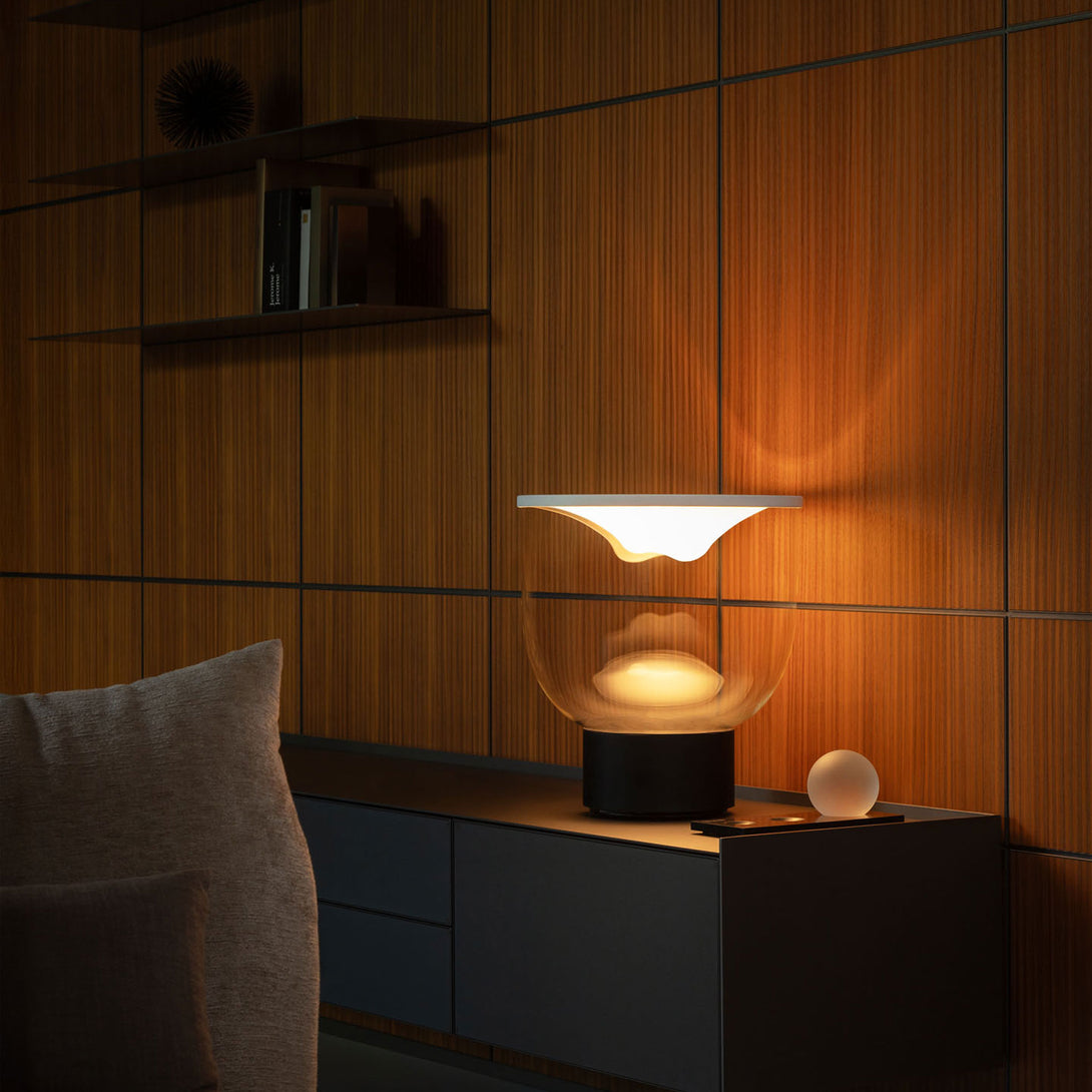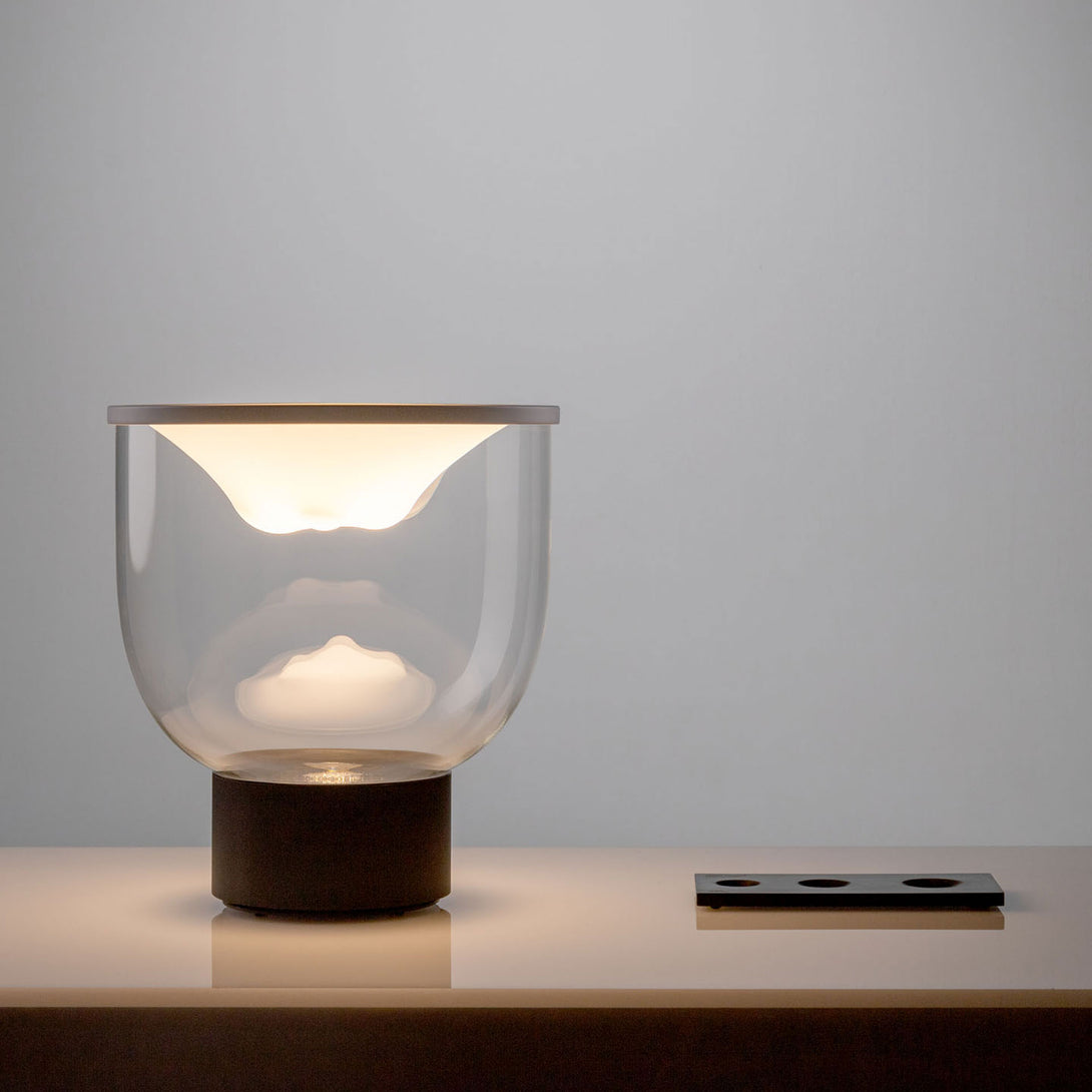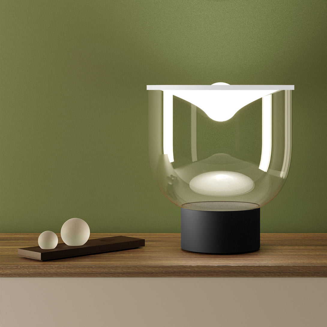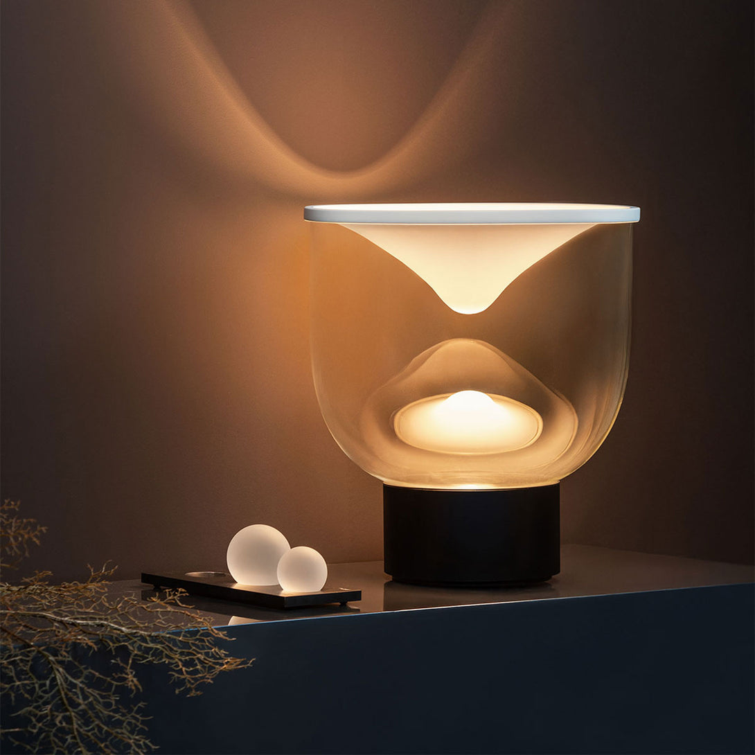 Grammoluce is a table lamp , designed by Min Dong of Habits Design for Martinelli Luce , characterised by an upper elastic membrane in Lycra® that covers the borosilicate glass structure, transforming the interaction into a new way to turn on and modulate the light.