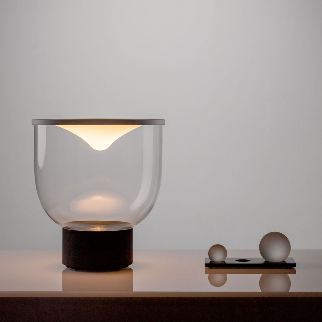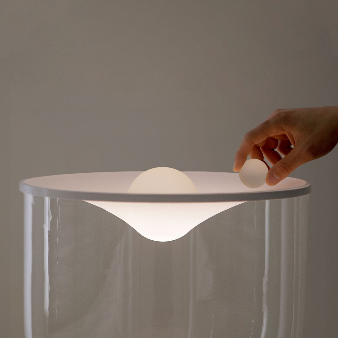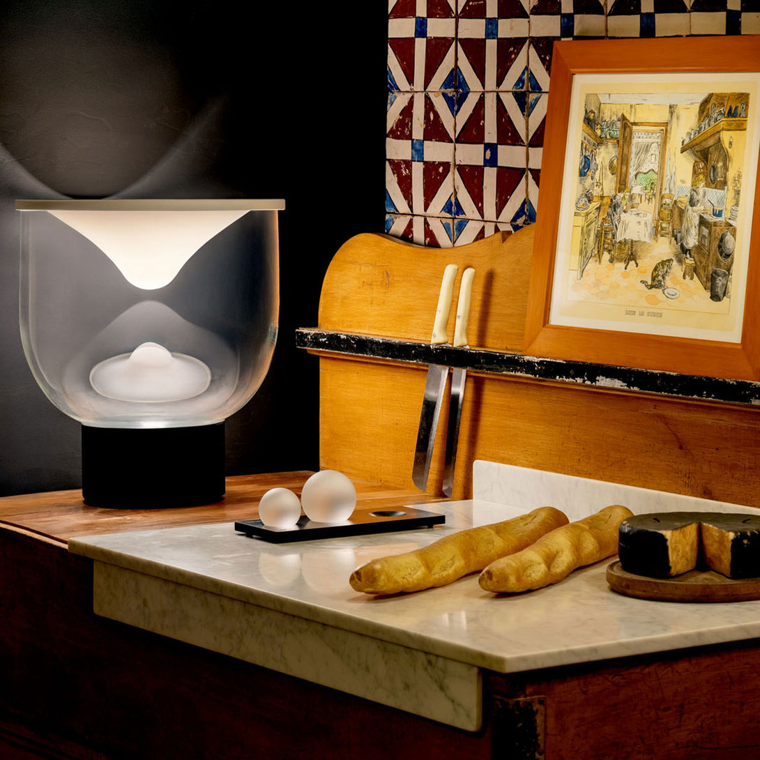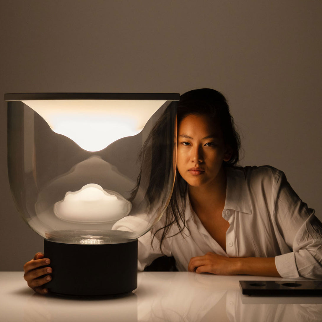 Grammoluce is a table lamp , designed by Min Dong of Habits Design for Martinelli Luce , characterised by an upper elastic membrane in Lycra® that covers the borosilicate glass structure, transforming the interaction into a new way to turn on and modulate the light.