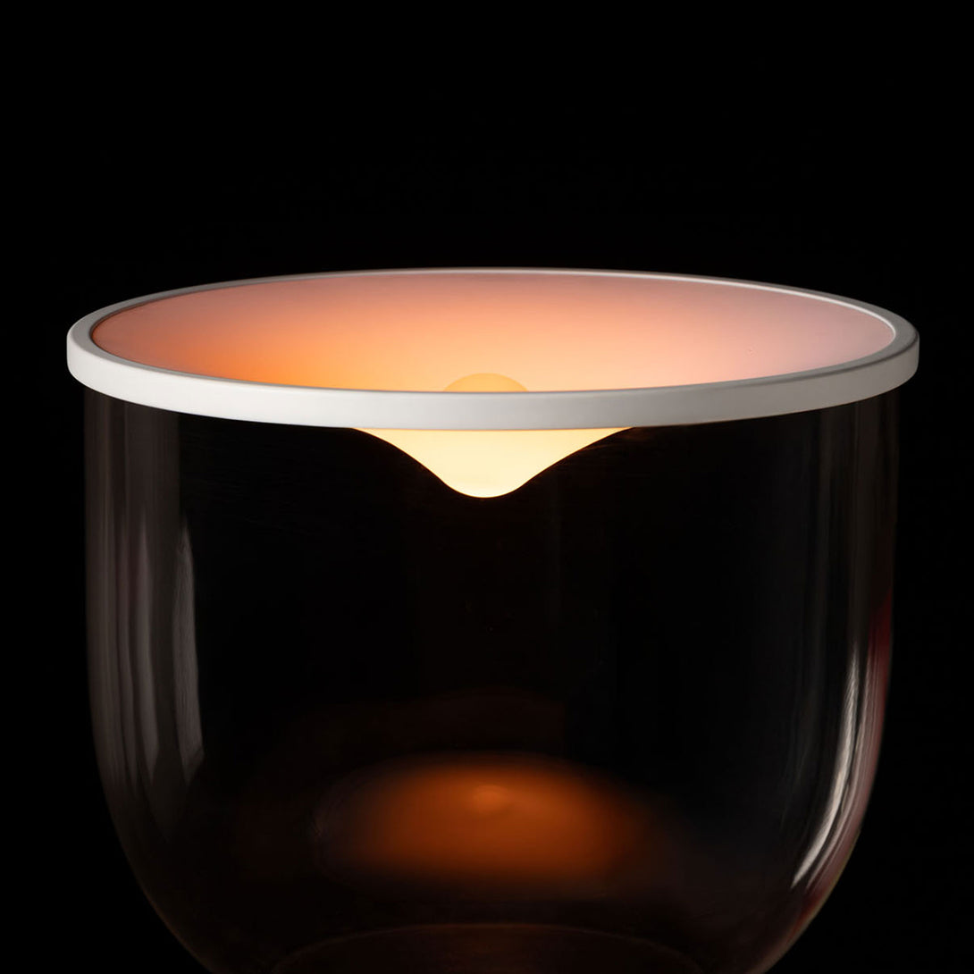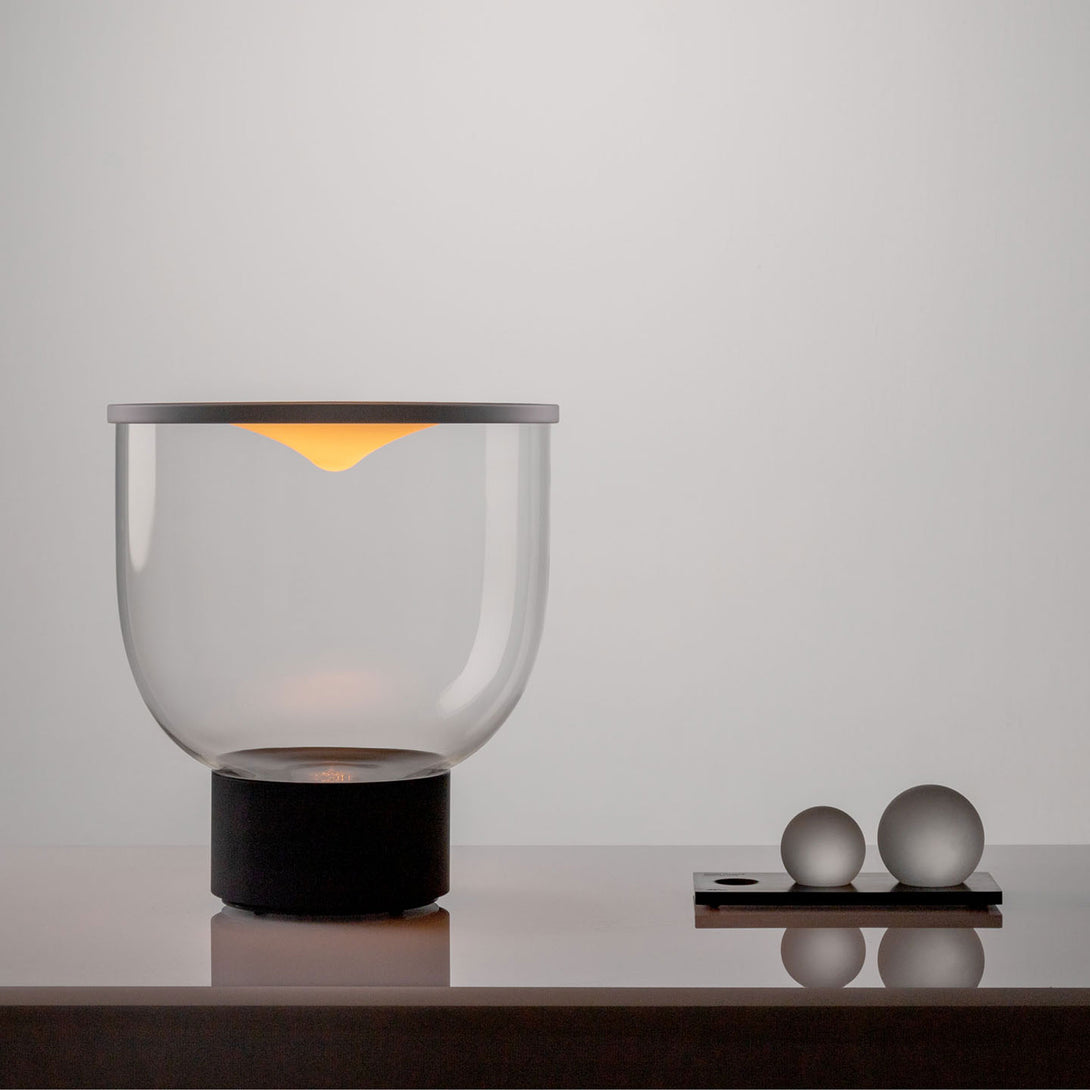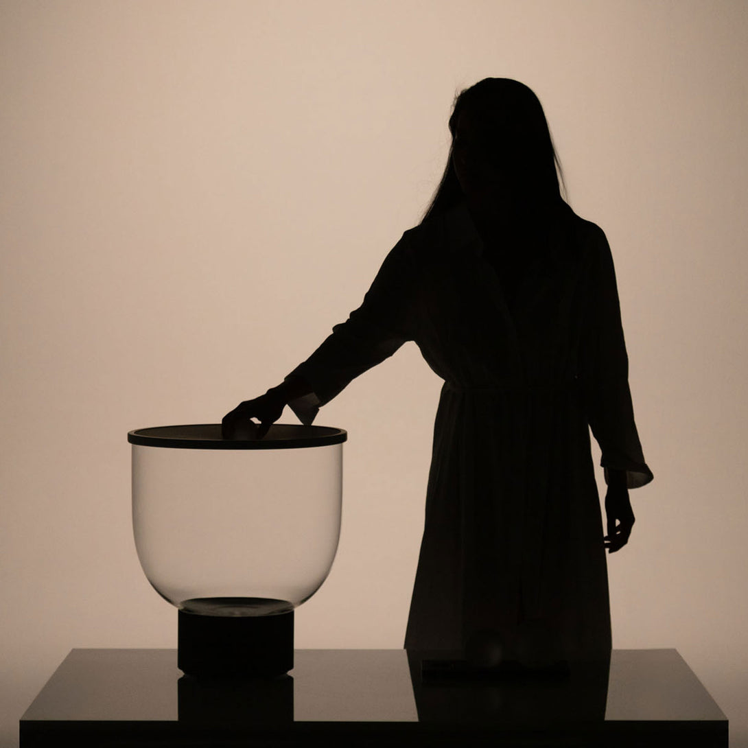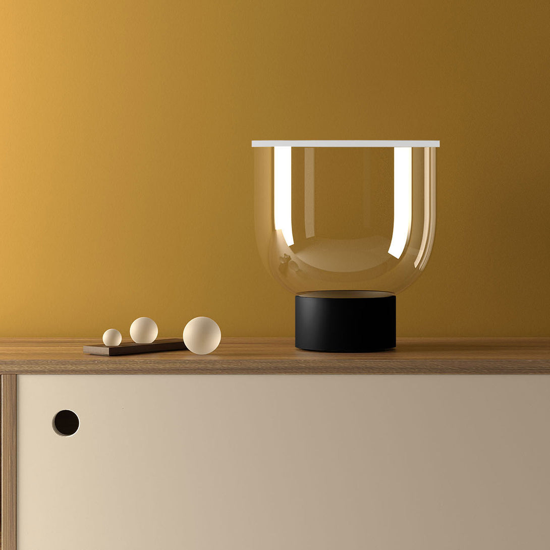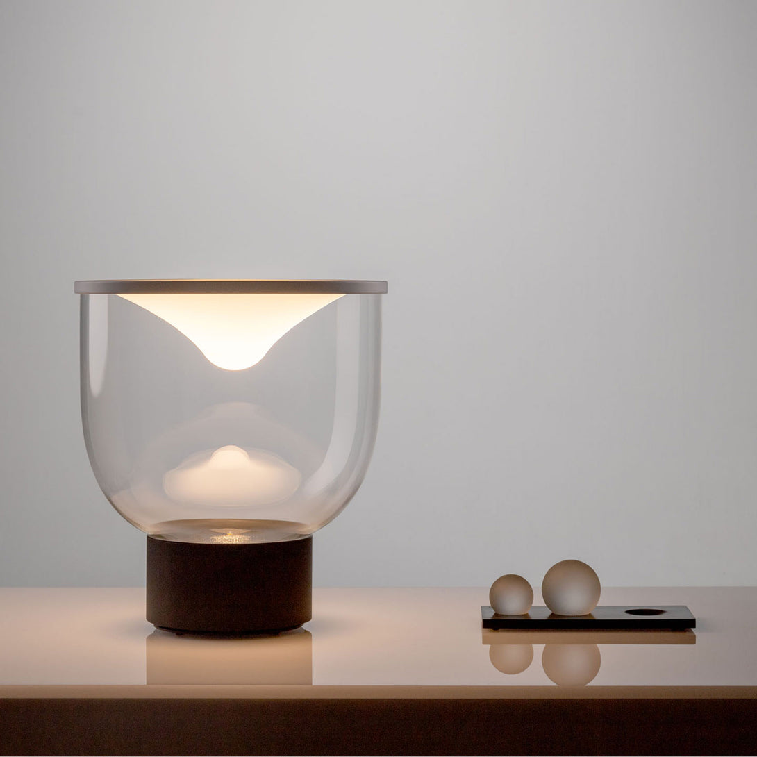 Grammoluce is a table lamp , designed by Min Dong of Habits Design for Martinelli Luce , characterised by an upper elastic membrane in Lycra® that covers the borosilicate glass structure, transforming the interaction into a new way to turn on and modulate the light.