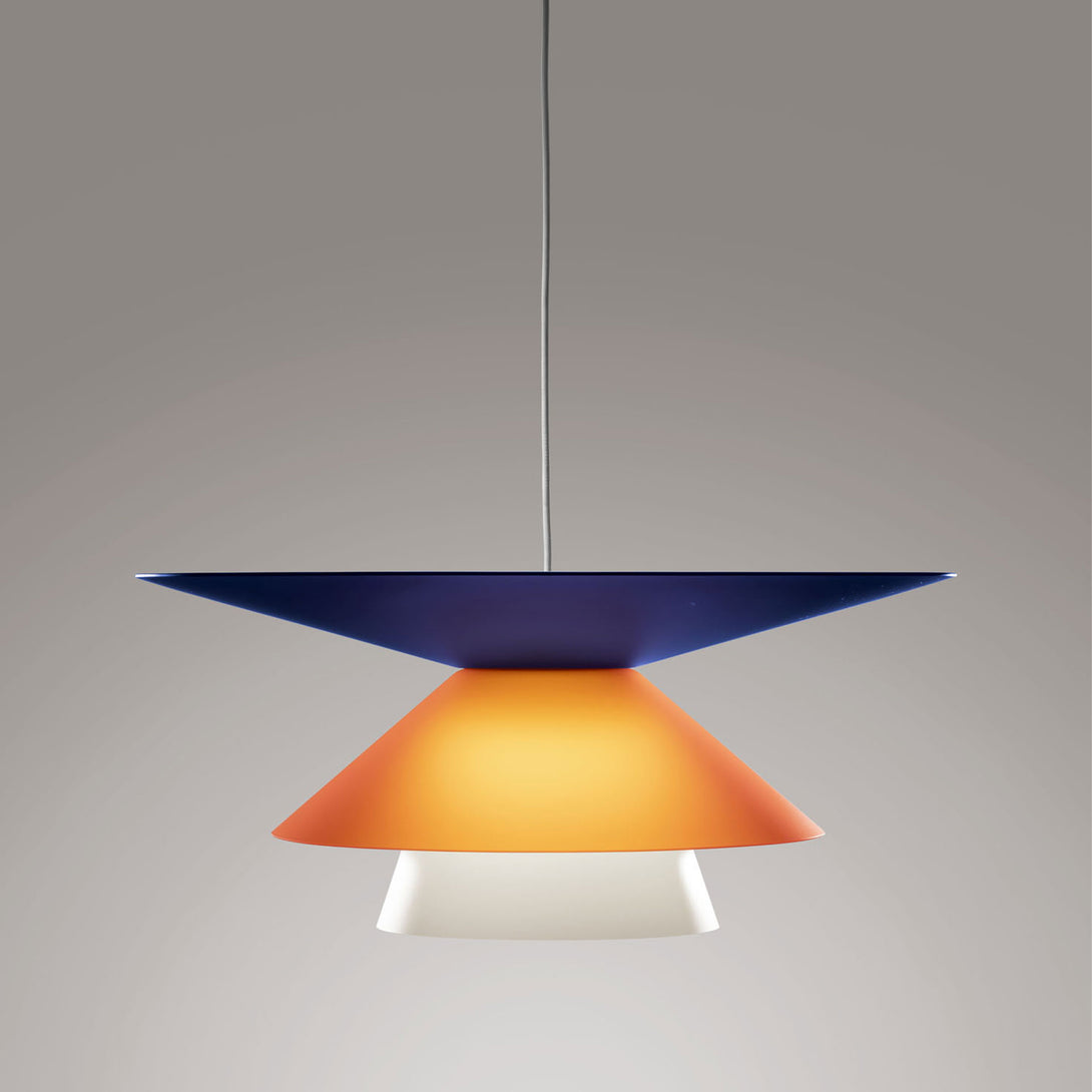 The diffusers are the true protagonists of Lady Galala . Available in three shapes and four colors ( white , yellow , blue , and orange ), they add personality to the space, modulating the intensity and beam of light. The combination of shapes and colors makes the pendant versatile and lightweight, perfect for both residential and professional settings.