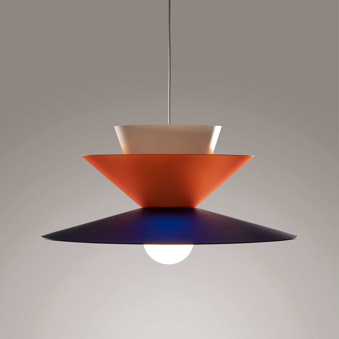 Indoor Diffuser . The diffusers are the true protagonists of Lady Galala . Available in three shapes and four colors (double-satin white, double-satin yellow, double-satin blue, and double-satin orange), they allow you to give personality to the space by modulating both the direction and type of light emitted. The combination of shapes and colors makes the suspension versatile and lightweight, perfect for both residential and professional settings.