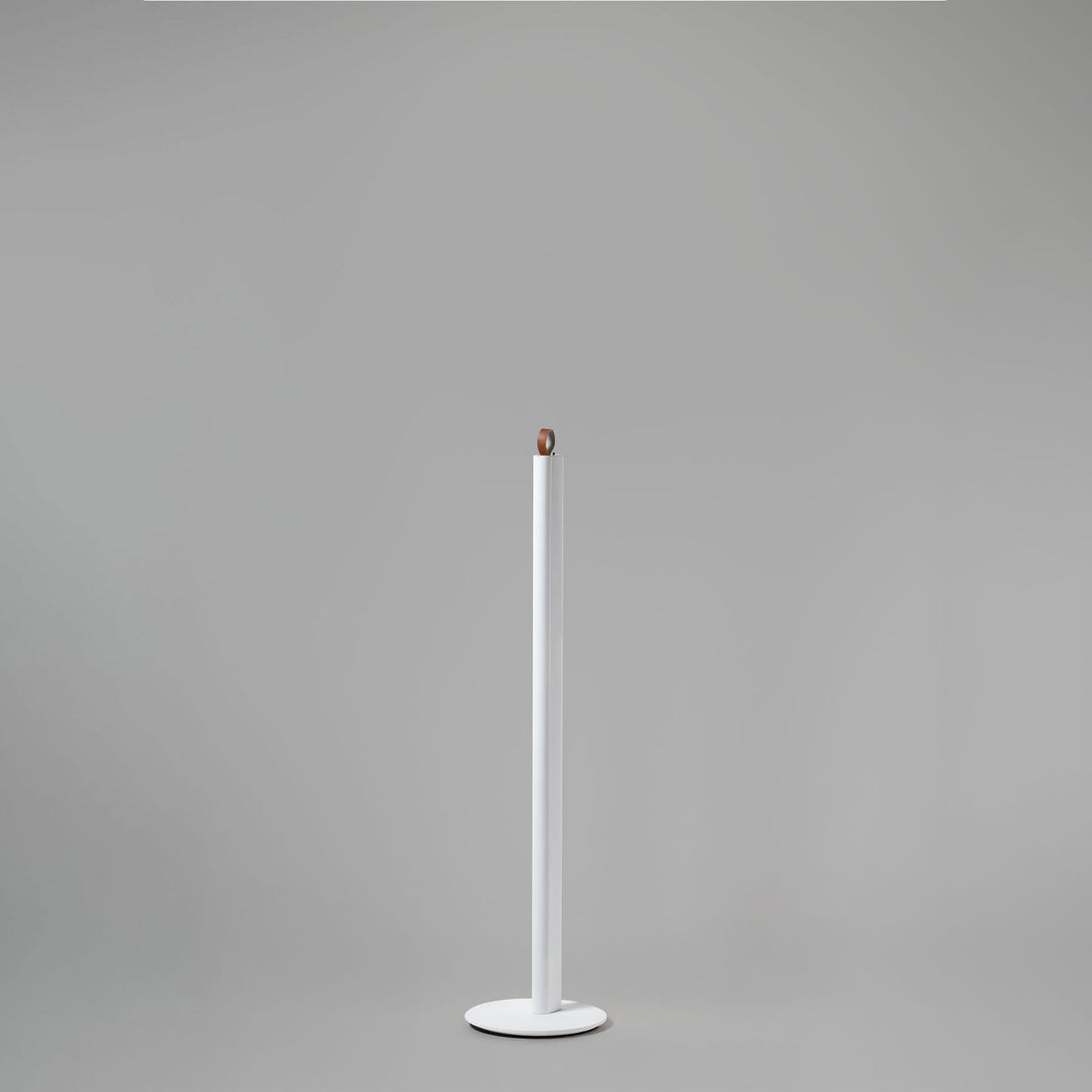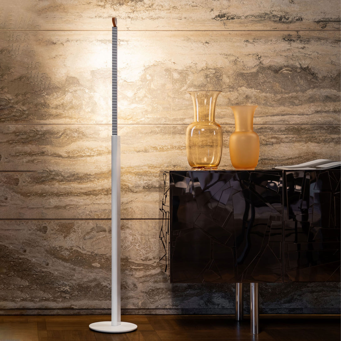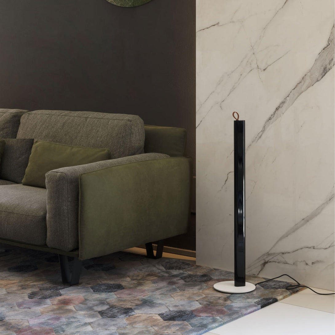 The Metrica floor lamp version features a 87.8 cm tall polished body resting on a circular iron base and a 50 cm tall LED light source. The height of the lamp and the position of the light source allow the light to be directed towards the wall, avoiding glare and enhancing the room with soft , diffused lighting.