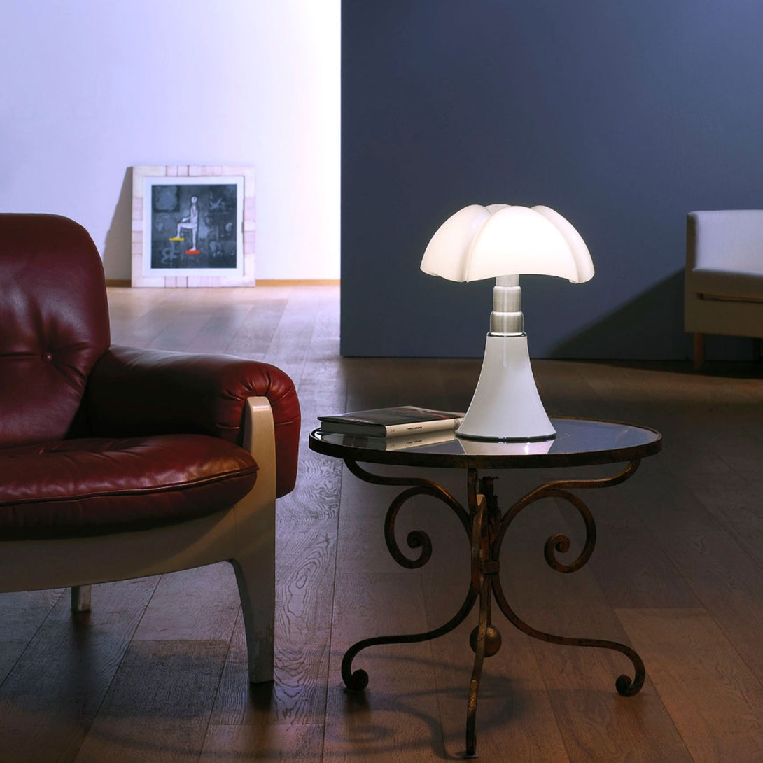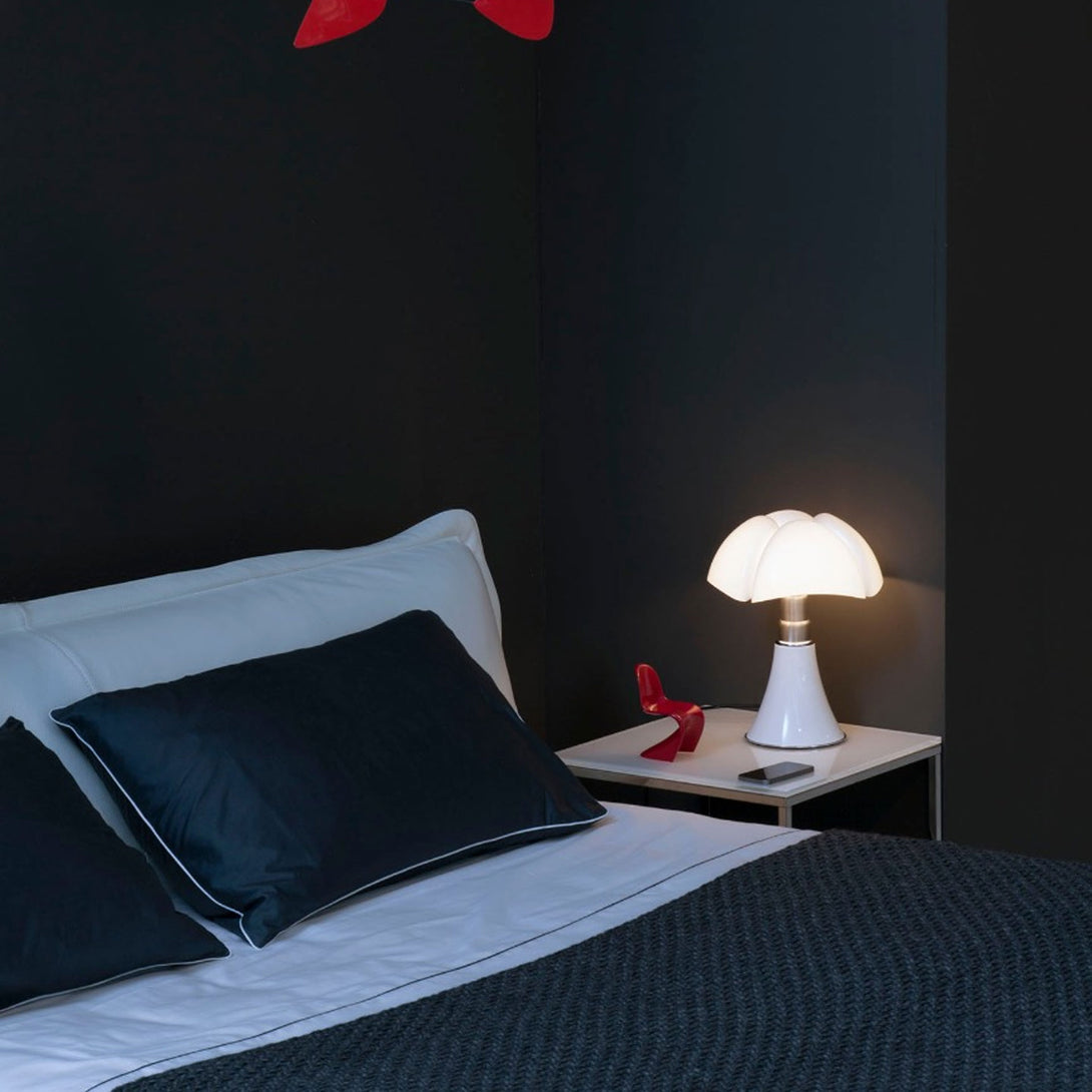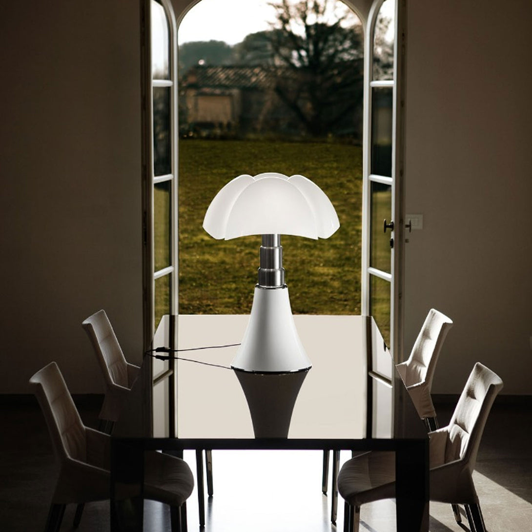 With its conical base and fan-shaped diffuser joined by a large knob, the Pipistrello lamp is a perfect conversation light, captivating with its expressive power and ability to diffuse a soft, enveloping light. Over the years, Martinelli Luce has enriched the original version with numerous variations , each maintaining the work's charm and originality. Today, the Pipistrello Table is also available in multiple finishes to suit any style, from classic pop to modern.