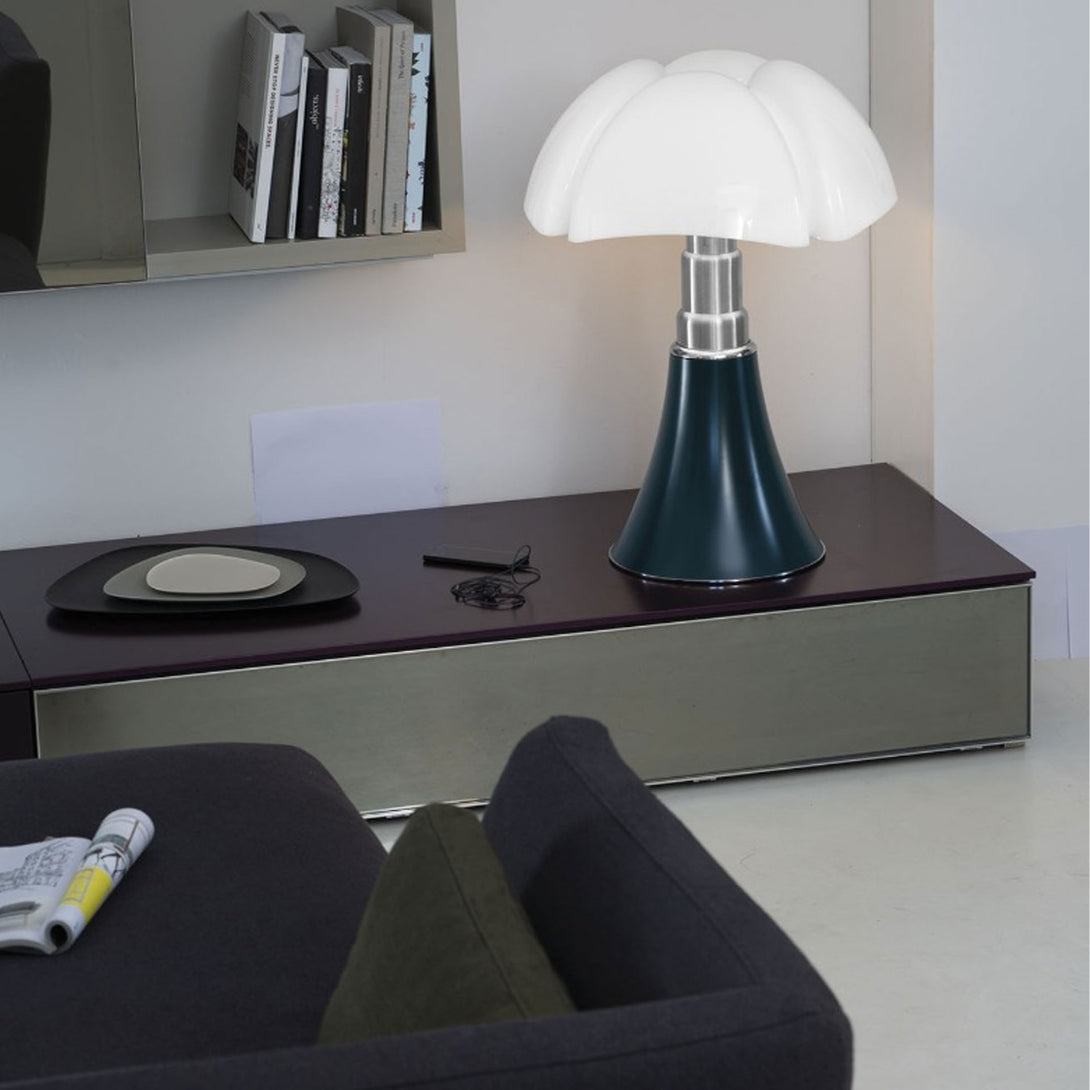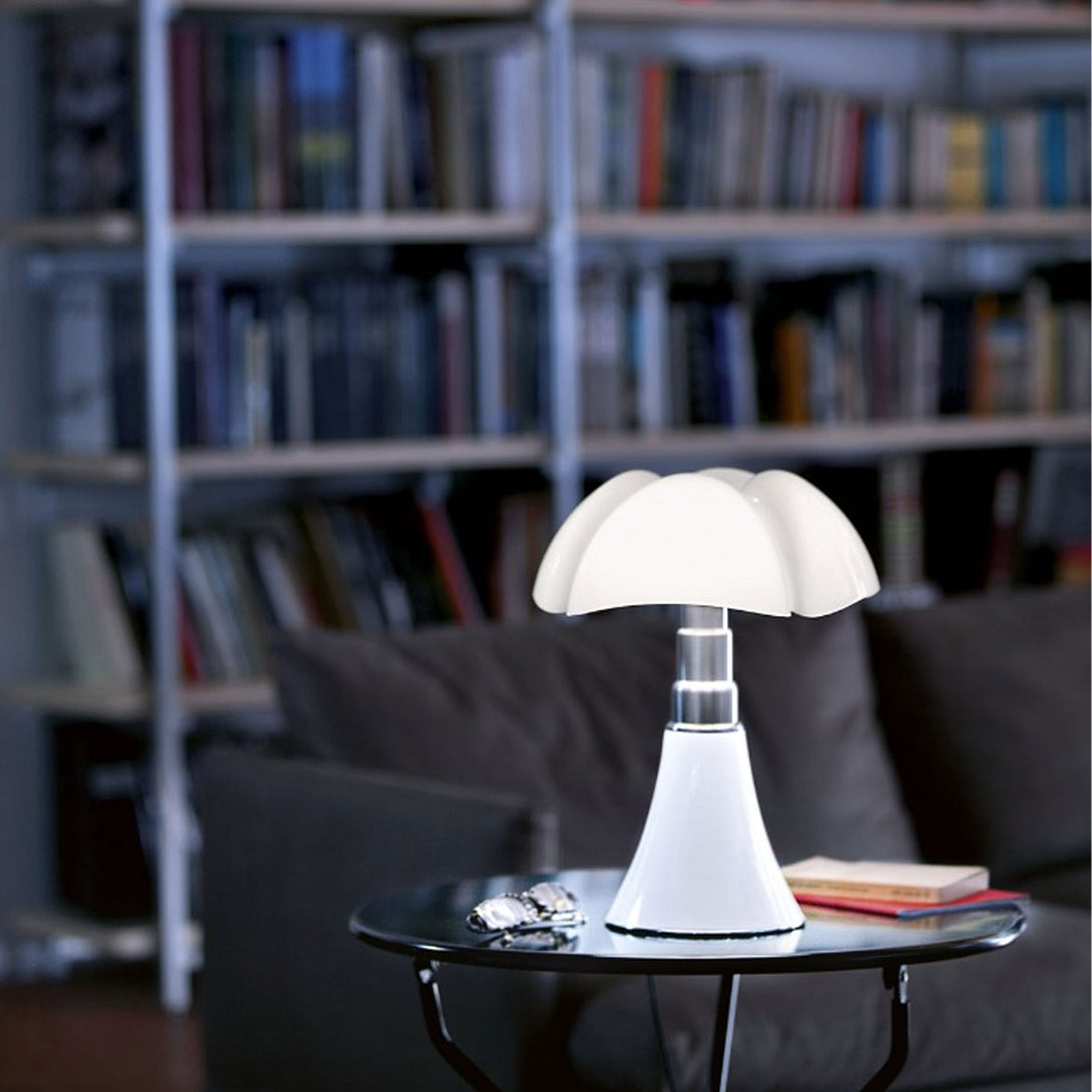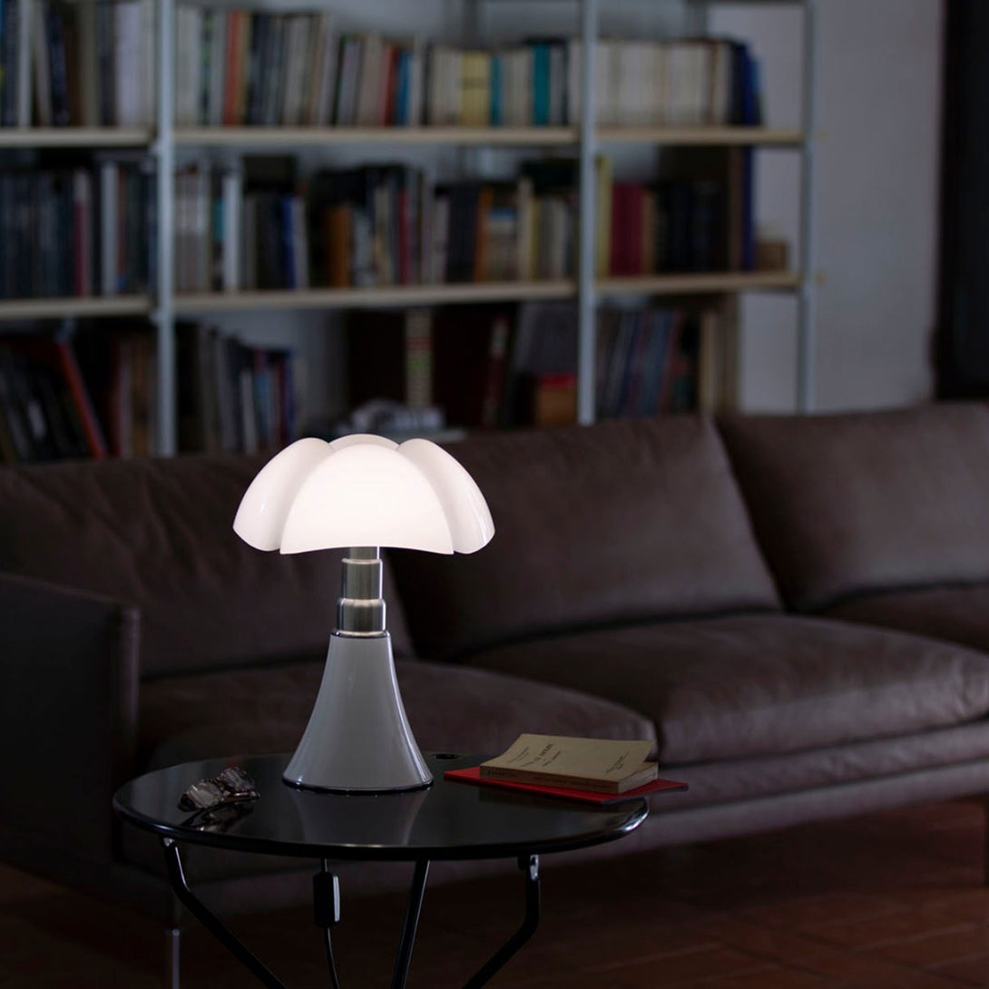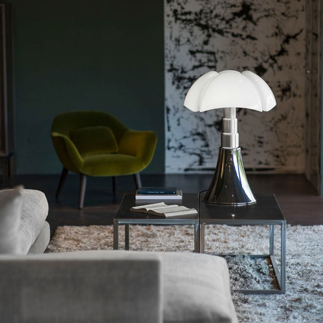 With its conical base and fan-shaped diffuser joined by a large knob, the Pipistrello lamp is a perfect conversation light, captivating with its expressive power and ability to diffuse a soft, enveloping light. Over the years, Martinelli Luce has enriched the original version with numerous variations , each maintaining the work's charm and originality. Today, the Pipistrello Table is also available in multiple finishes to suit any style, from classic pop to modern.