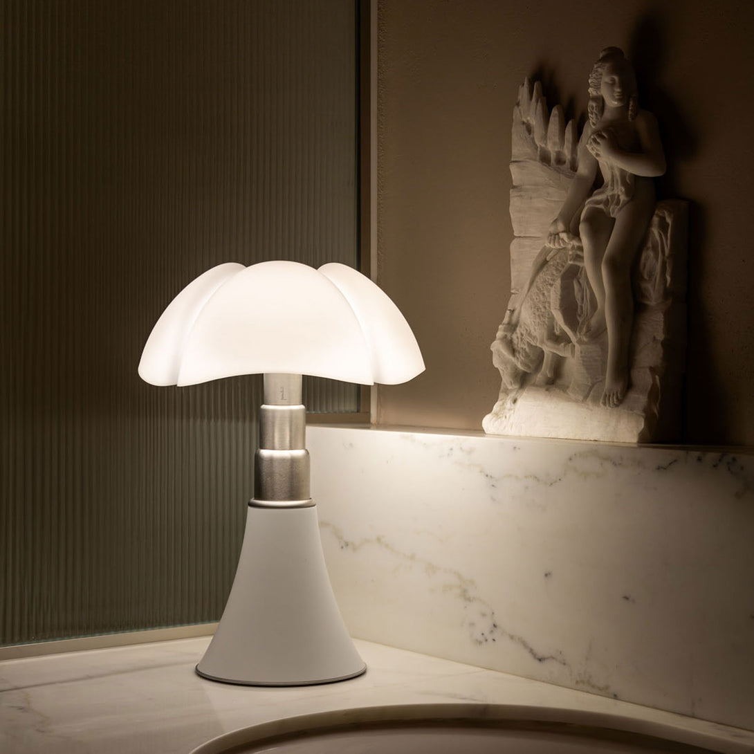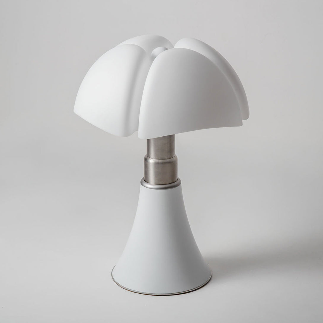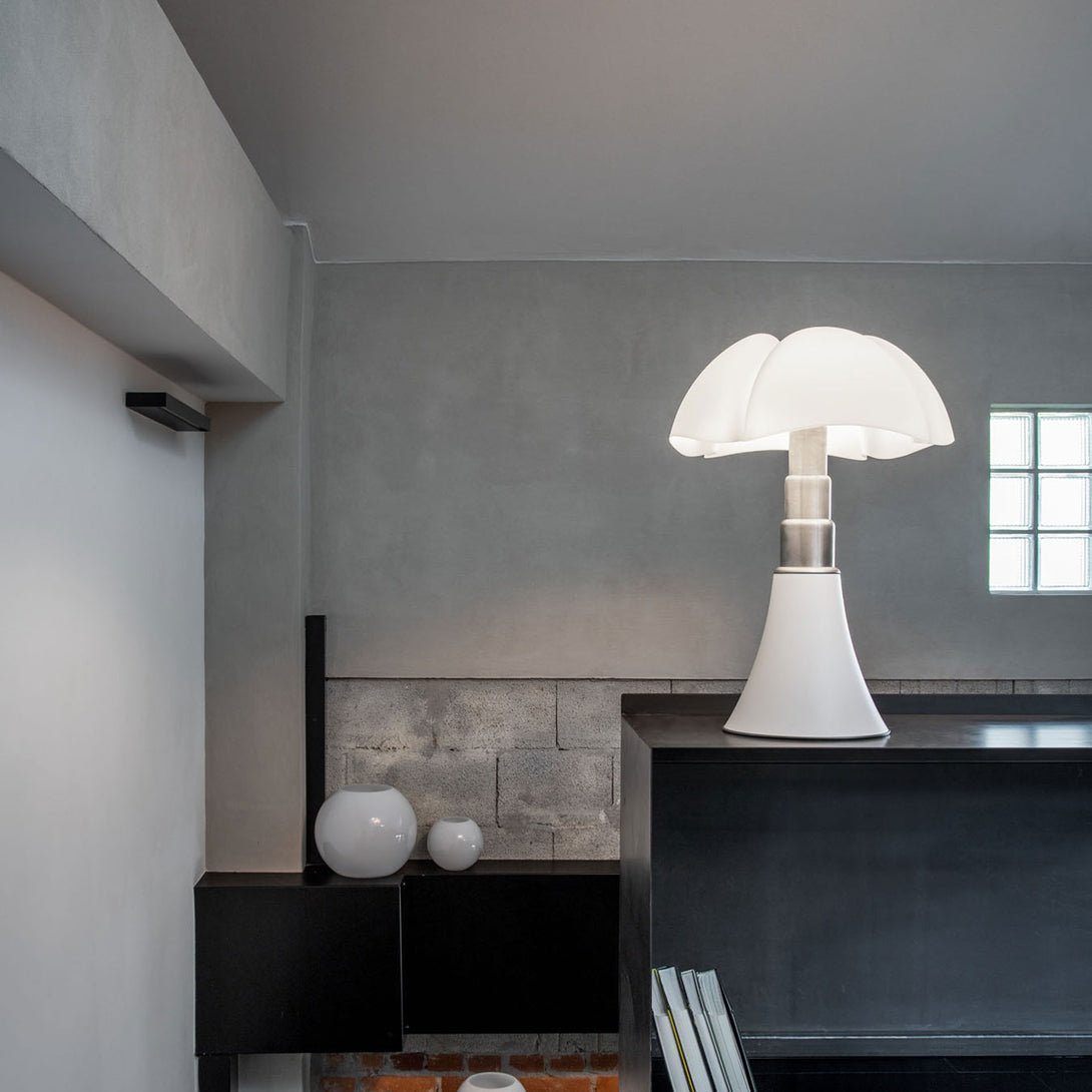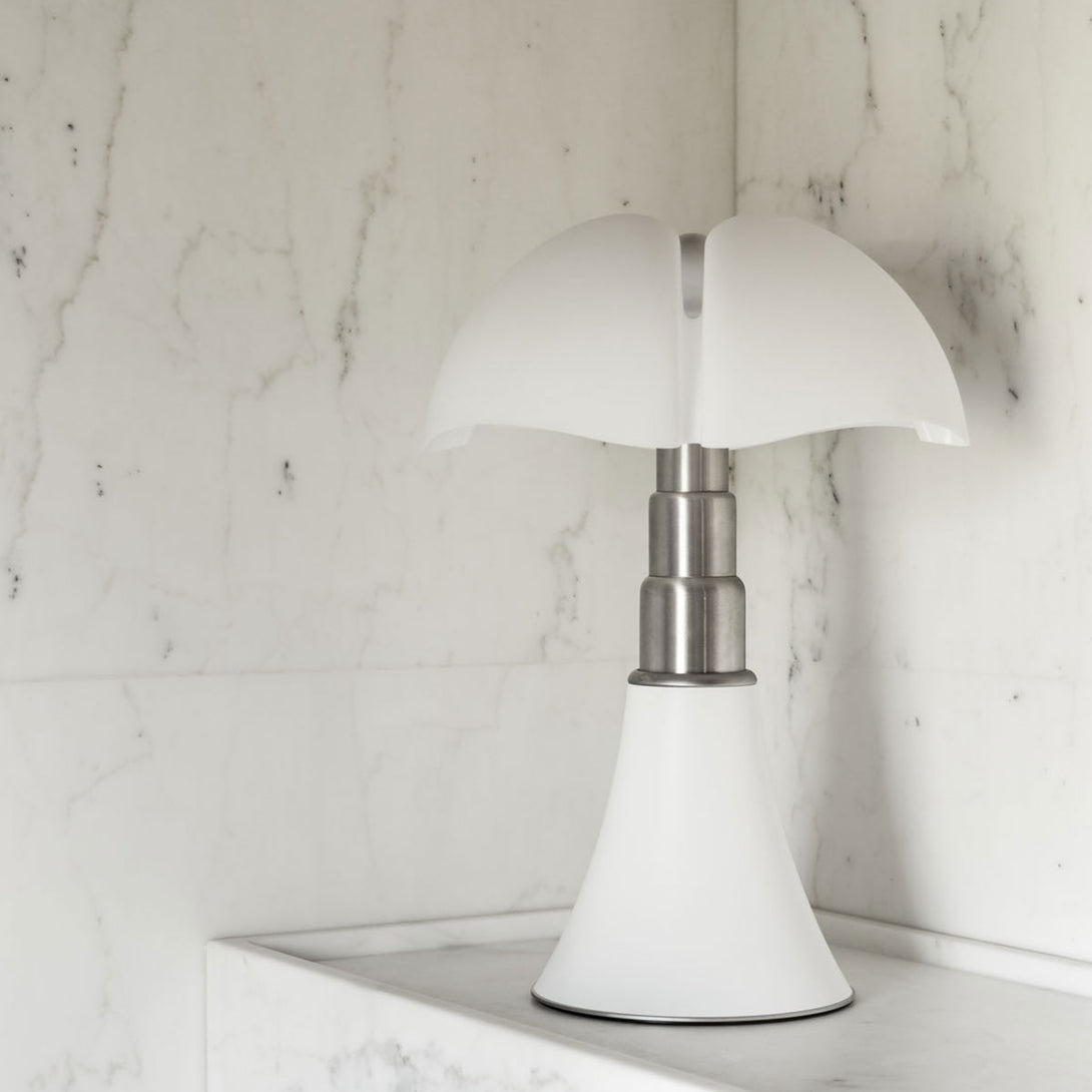 With its conical base and fan-shaped diffuser joined by a large knob, the Pipistrello lamp is a perfect conversation light, captivating with its expressive power and ability to diffuse a soft, enveloping light. Over the years, Martinelli Luce has enriched the original version with numerous variations , each maintaining the work's charm and originality. Today, the Pipistrello Table is also available in multiple finishes to suit any style, from classic pop to modern.