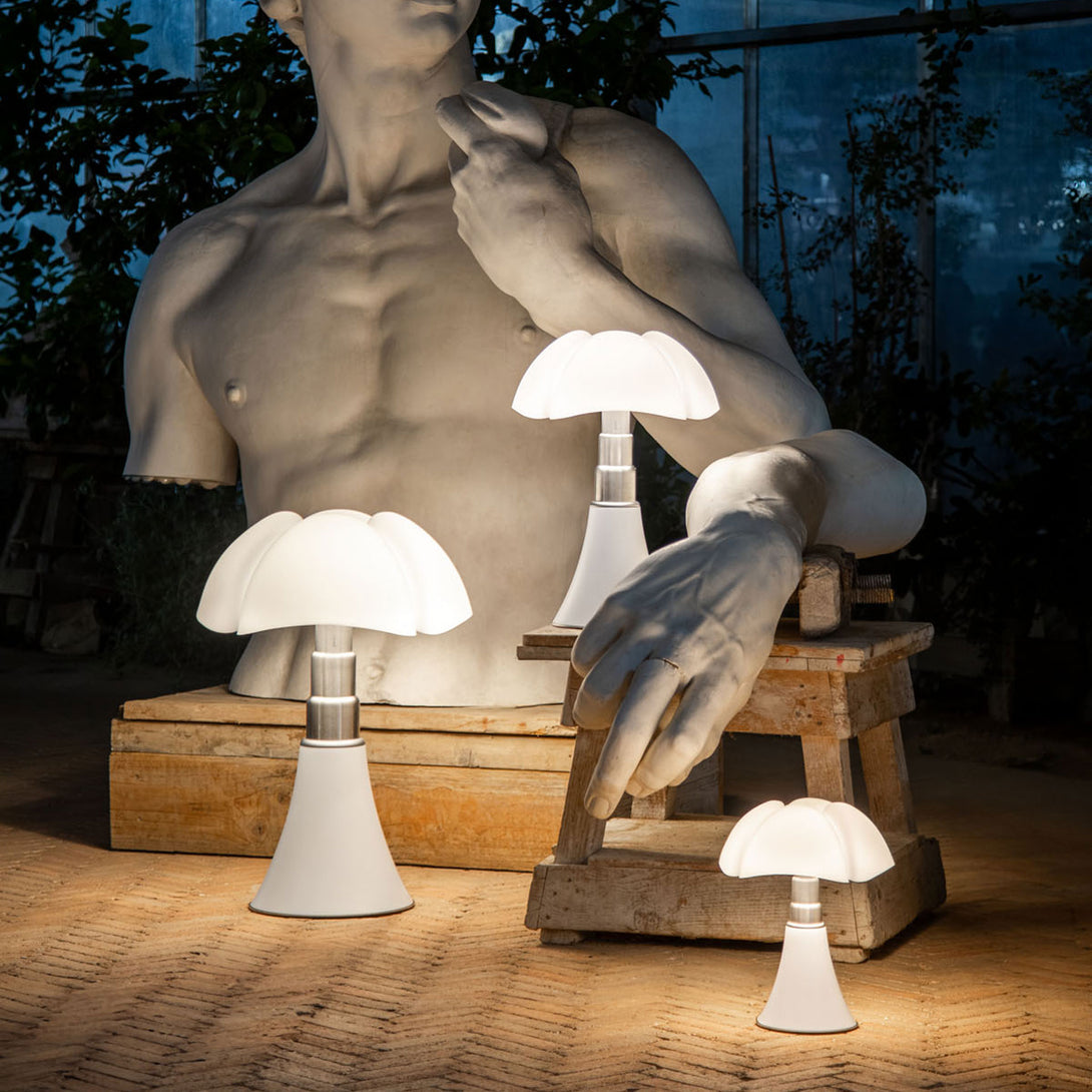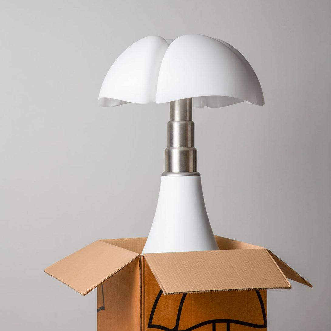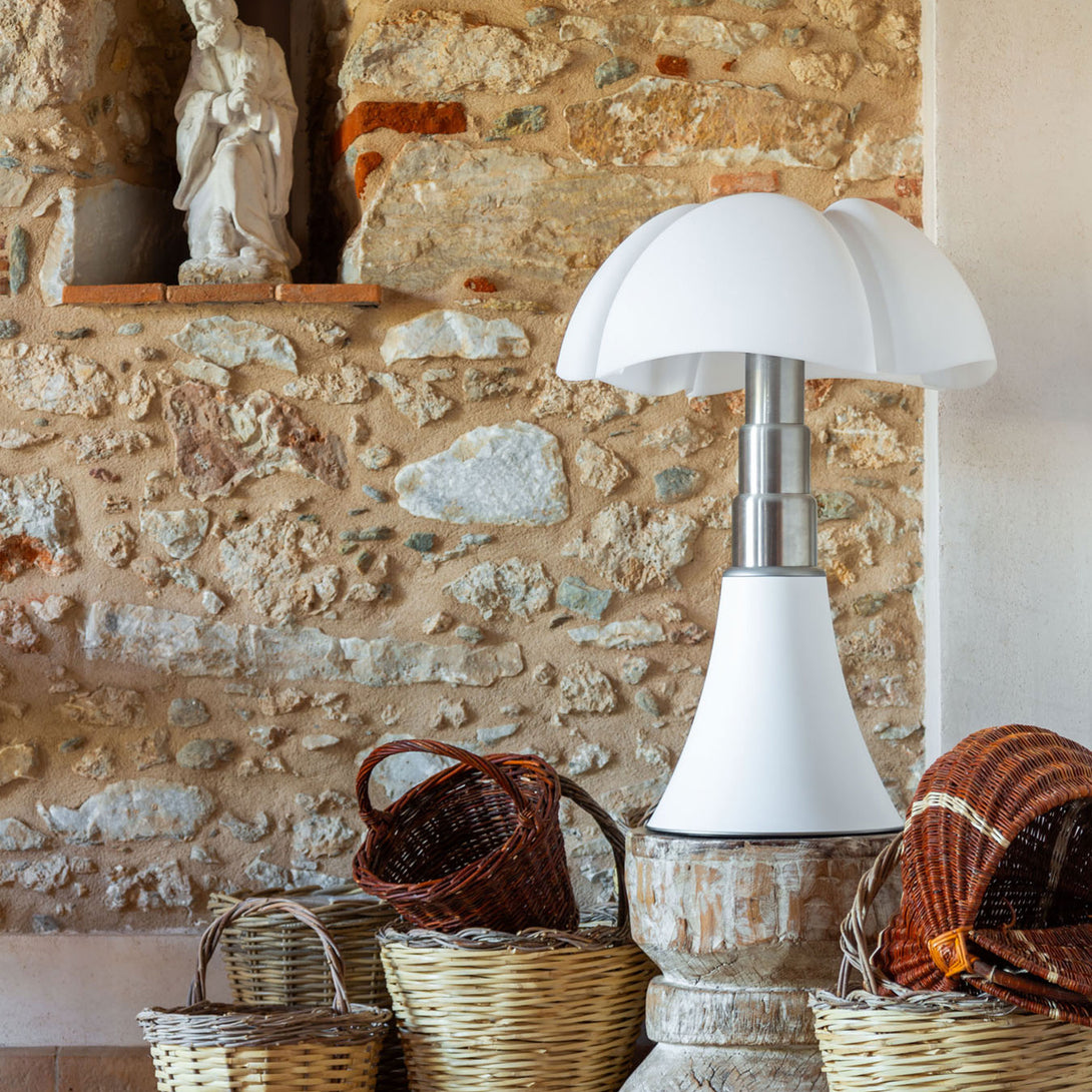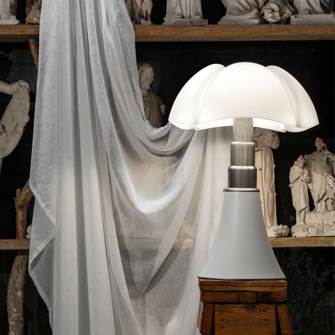With its conical base and fan-shaped diffuser joined by a large knob, the Pipistrello lamp is a perfect conversation light, captivating with its expressive power and ability to diffuse a soft, enveloping light. Over the years, Martinelli Luce has enriched the original version with numerous variations , each maintaining the work's charm and originality. Today, the Pipistrello Table is also available in multiple finishes to suit any style, from classic pop to modern.