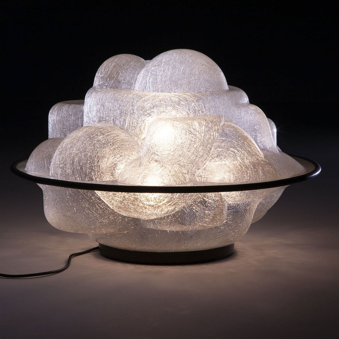 Made with a transparent methacrylate diffuser and fibreglass - reinforced polyester , a rubber connecting ring and a lacquered metal base, the Profiterolle lamp combines visual lightness and constructive solidity.