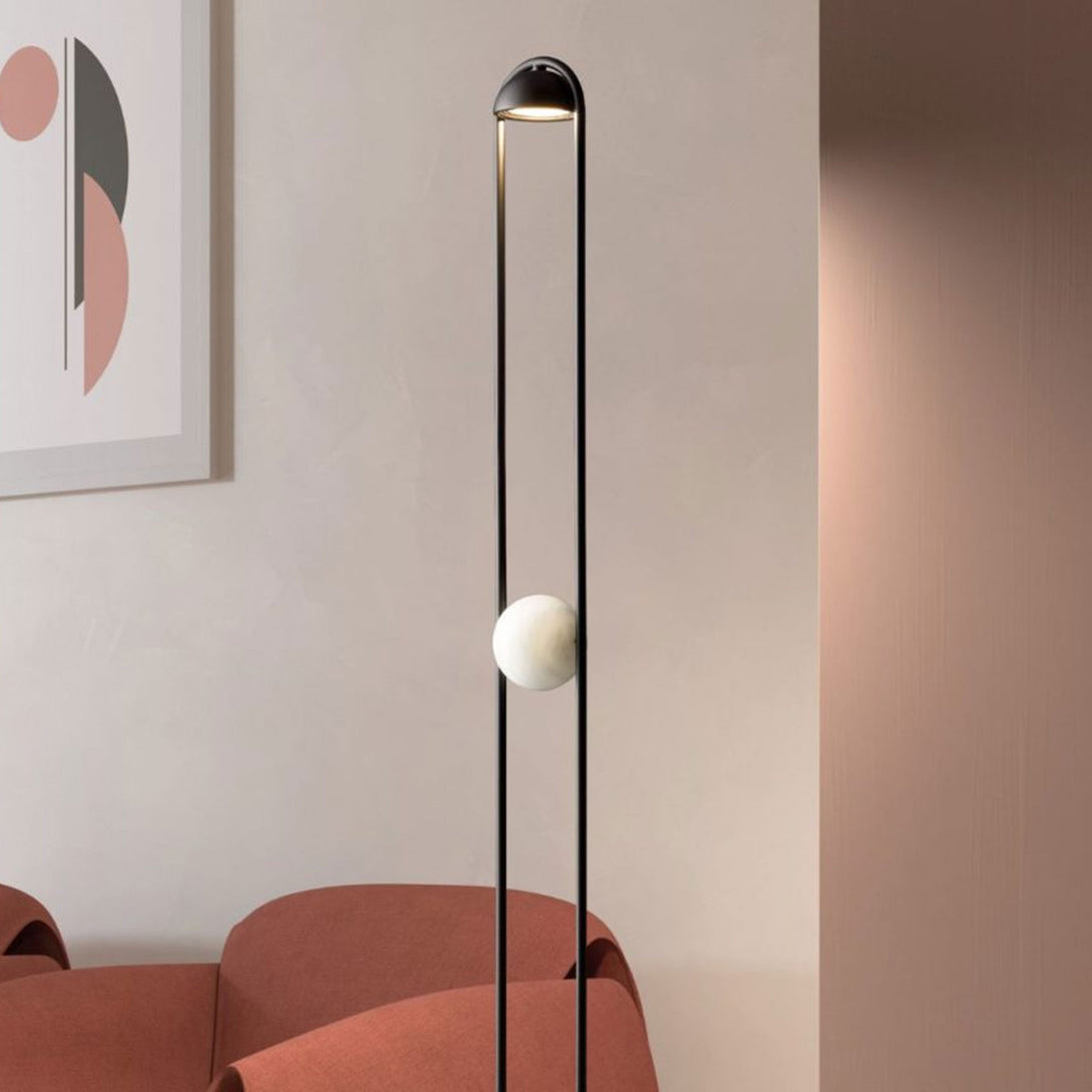 The Luppiter lamp is made with a painted metal frame and lampshade. Some of the lamps in the family include a sphere available in metal or alabaster , which diffuses the LED light softly and warmly . The contrast between matte and shiny surfaces gives the project a contemporary yet discreet character.