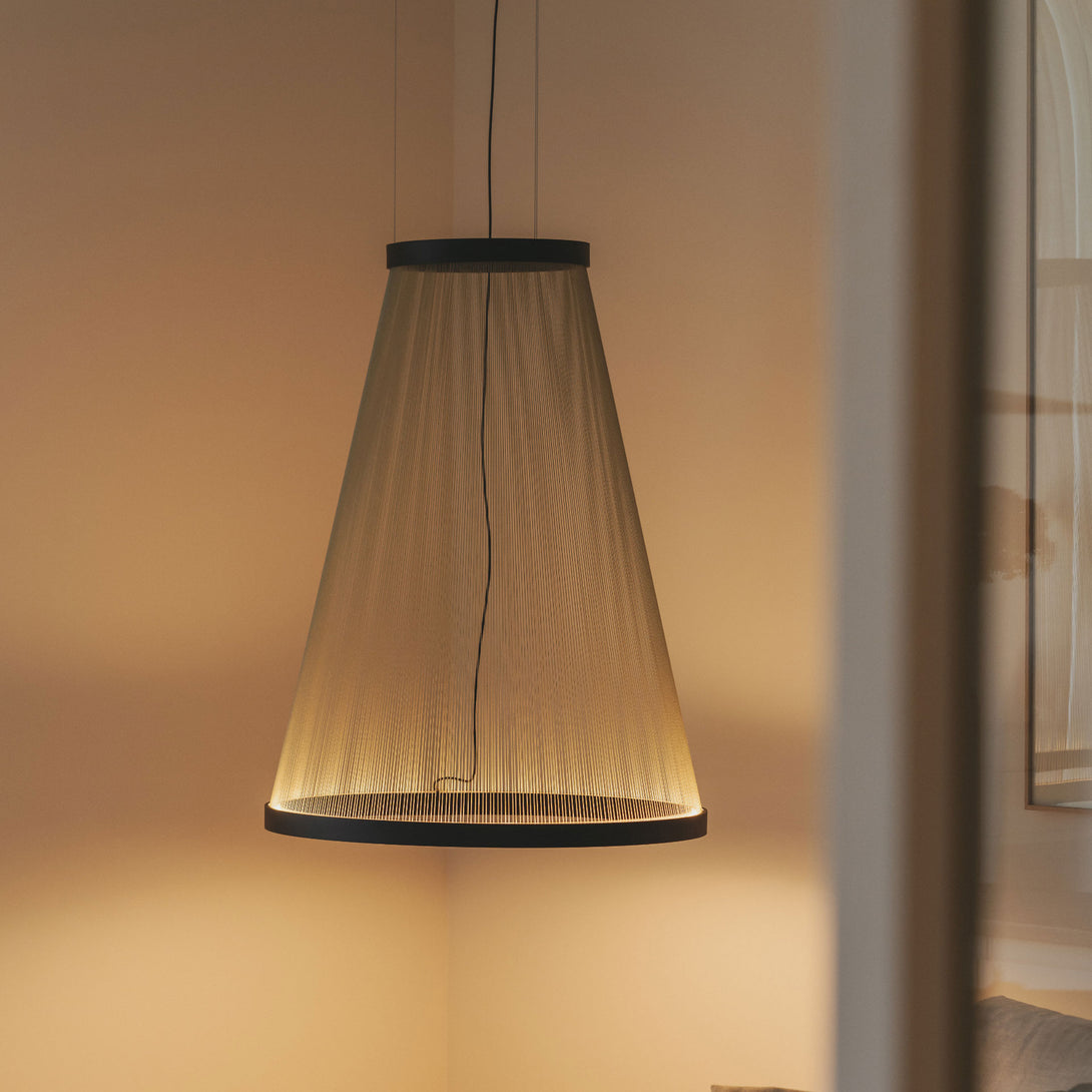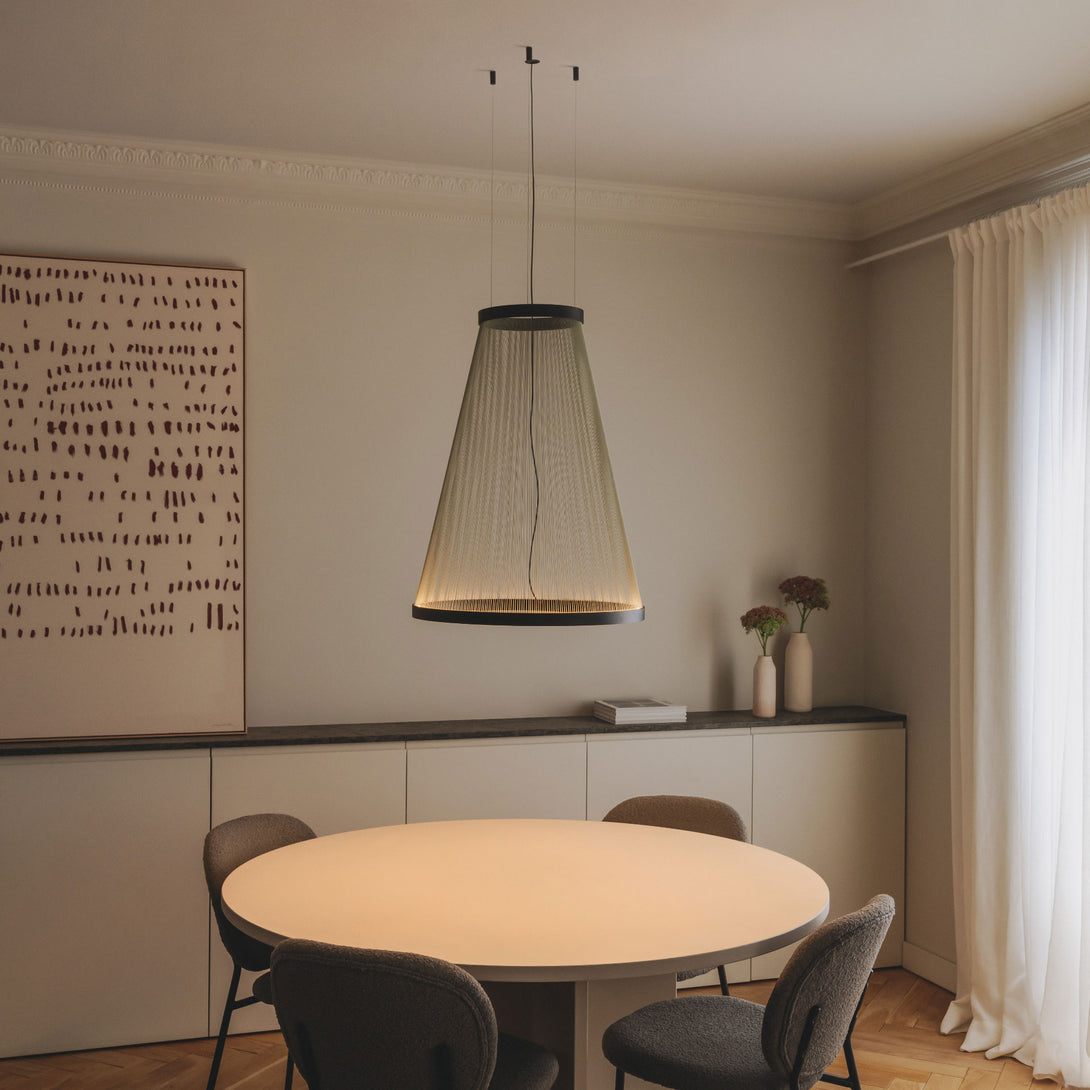 Presented by Vibia in an elegant variety of conical and cylindrical silhouettes, the Array lamps float, seductive and brilliant, evoking a sense of refinement appreciable in any context, while the imposing dimensions do not at all limit their use to public and commercial contexts, while the smaller models, suitable for residential use, give an intimate and dynamic atmosphere thanks to a combination of tension and balance.