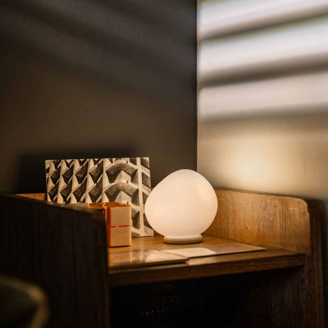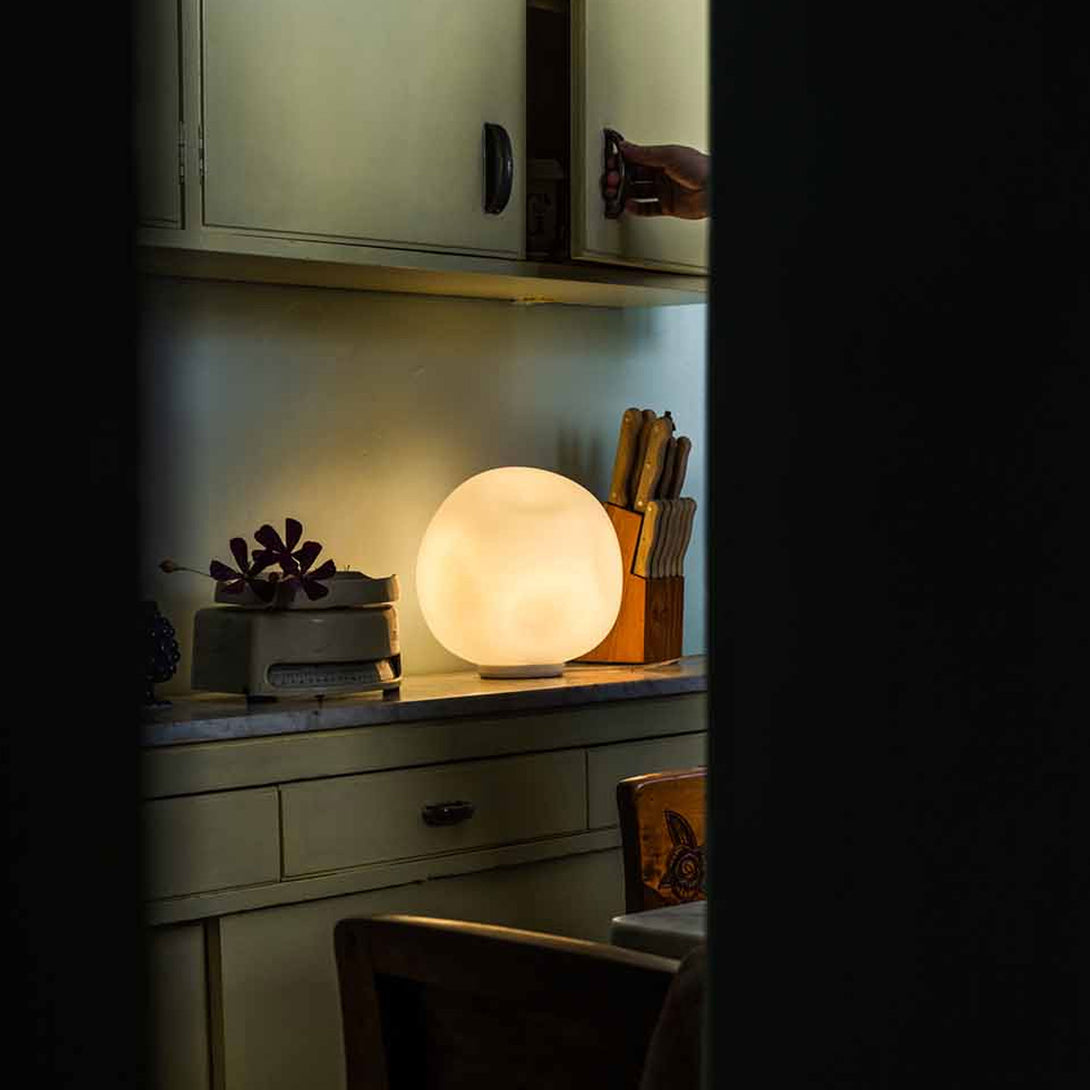 Materiali: diffusore in vetro opale soffiato a bocca acidato, base di appoggio in metallo verniciato a polveri epossidiche e supporto del portalampada in poliammide naturale opaco stampato ad iniezione.