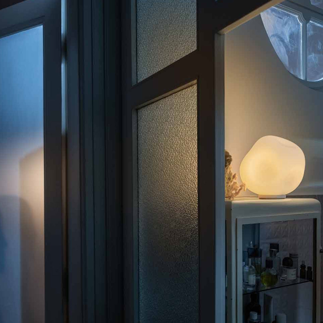 Antigeometrica, imperfetta ed ancestrale: Hoba è una famiglia di lampade in cui l'unicità è il cardine di tutta la sua forza espressiva, attraverso un'aspetto che solitamente non ha spazio alcuno, come un sasso caduto dal cielo, deformato dalla velocità e cristallizzato nell’attimo del volo.