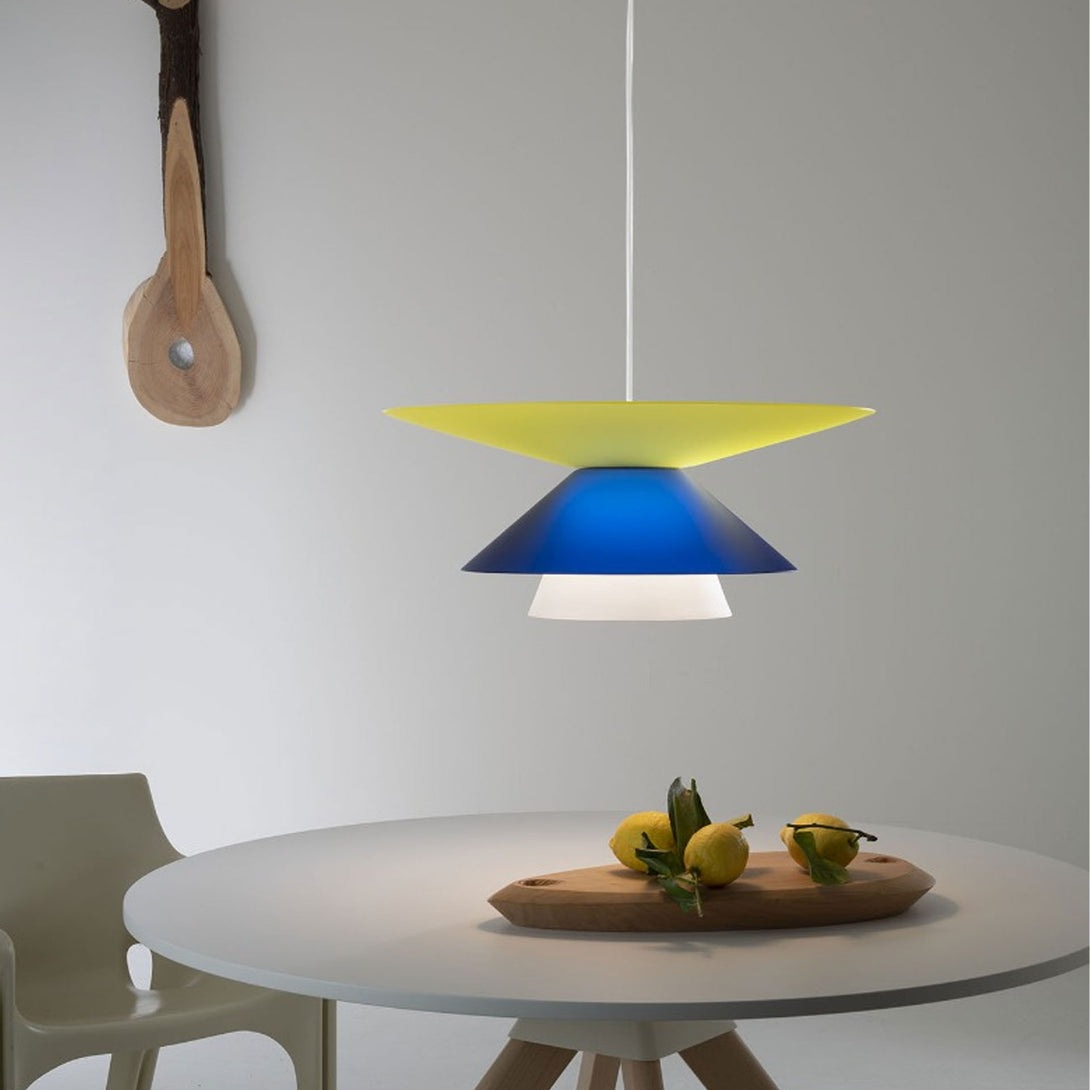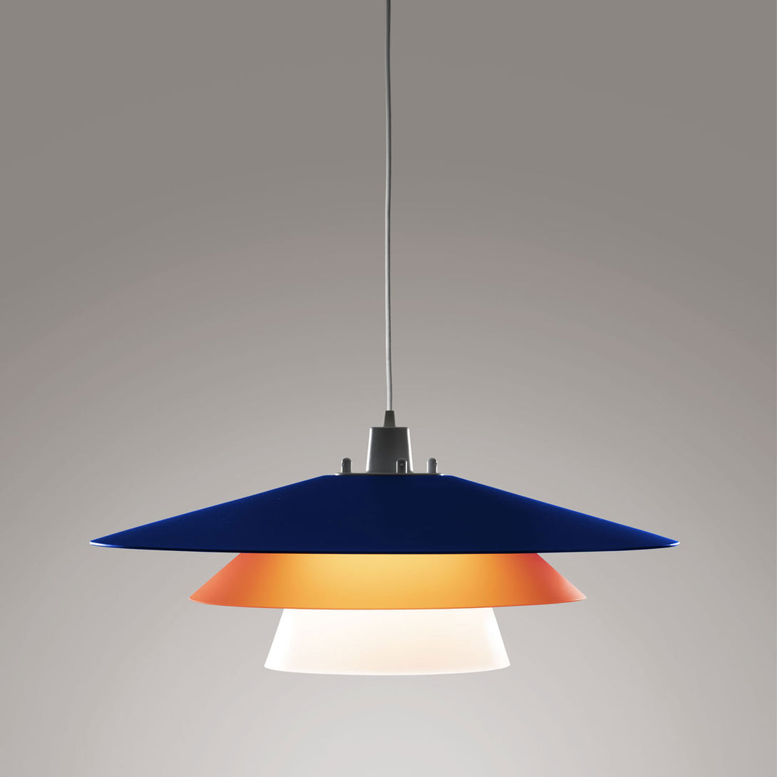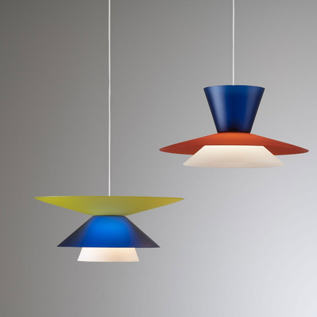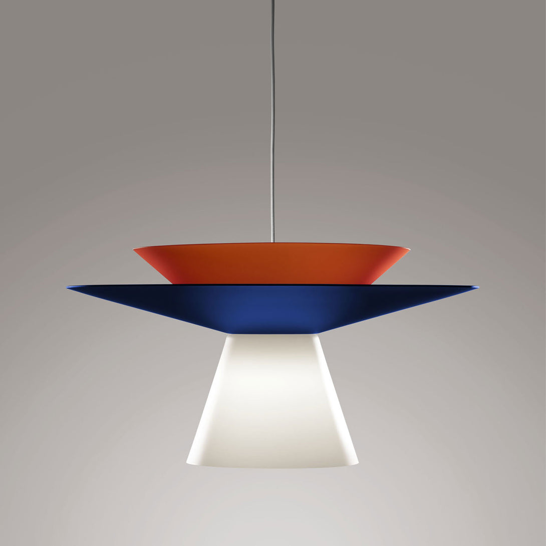 I diffusori sono i veri protagonisti di Lady Galala. Disponibili in tre forme e quattro colori (bianco, giallo, blu e arancio), danno personalità all’ambiente, modulando intensità e fascio luminoso. L’abbinamento di forme e colori rende la sospensione versatile e leggera, perfetta per contesti sia residenziali che professionali.