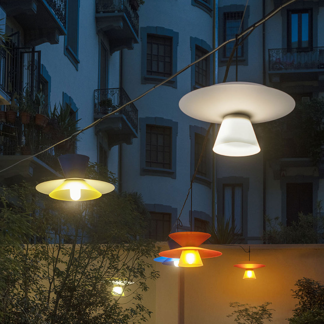 Disponibile nelle versioni indoor e outdoor, la lampada a sospensione Lady Galala è caratterizzata dal corpo centrale capace di sostenere fino a 3 diffusori colorati, consentendo una composizione completamente personalizzata. I tre coni, di forme, diametri, altezze e finiture differenti, permettono di realizzare fino ad otto configurazioni diverse.