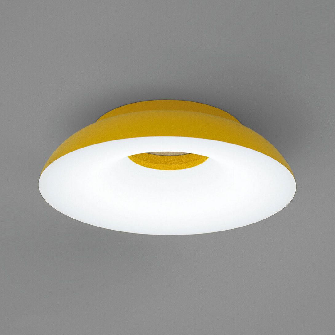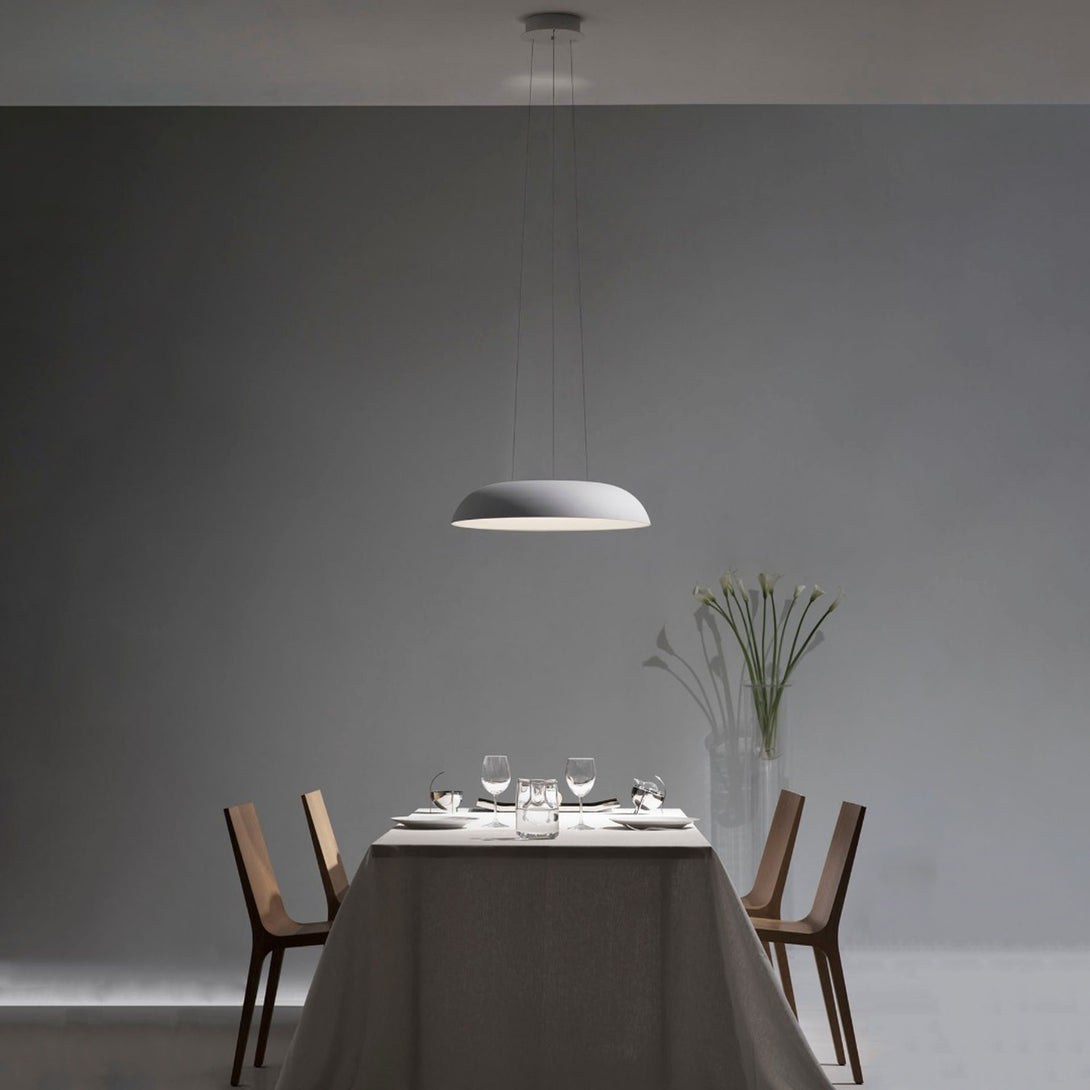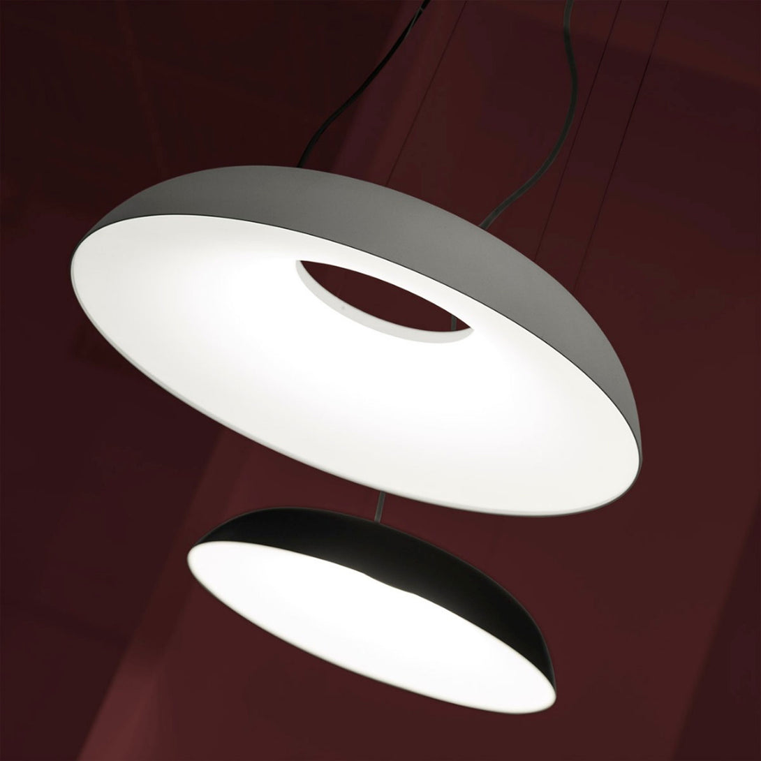 Maggiolone è proposta in due varianti: lampada a sospensione, disponibile in due dimensioni, e lampada da soffitto. Entrambe condividono la stessa essenzialità formale, con struttura in alluminio verniciato e diffusore in metacrilato bianco frost che assicura una luce morbida e uniforme.