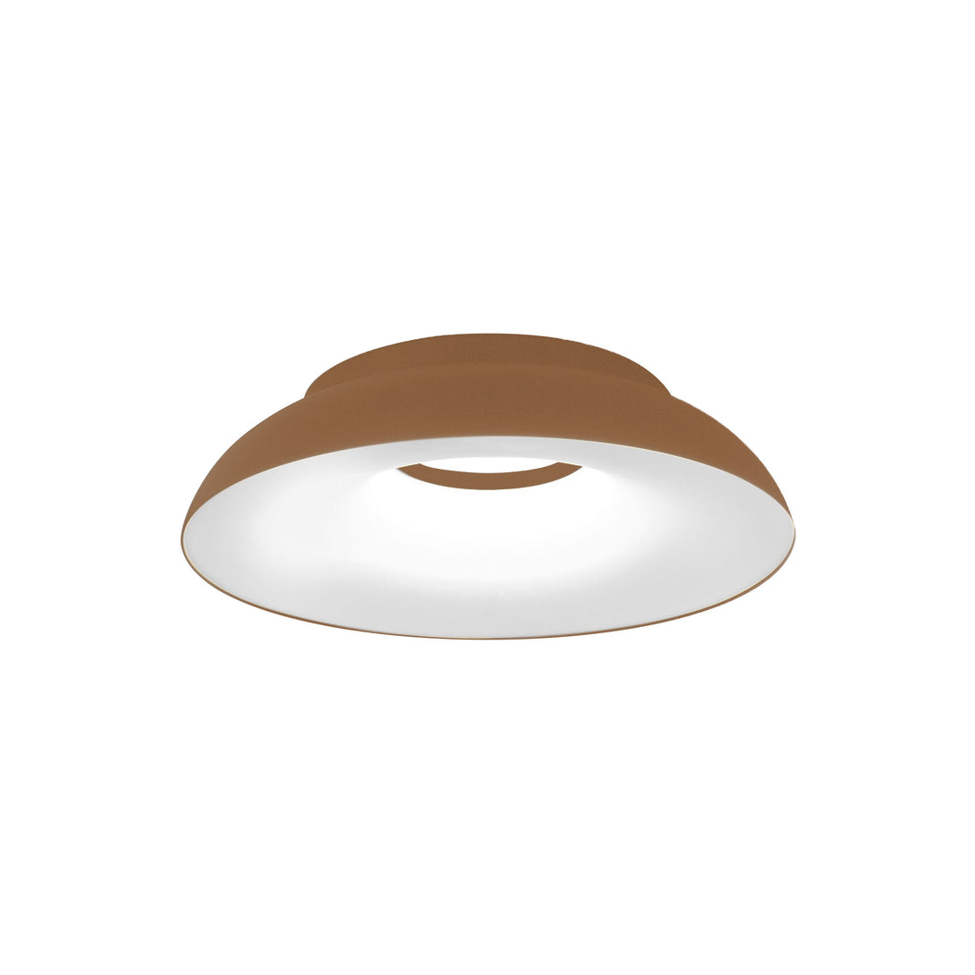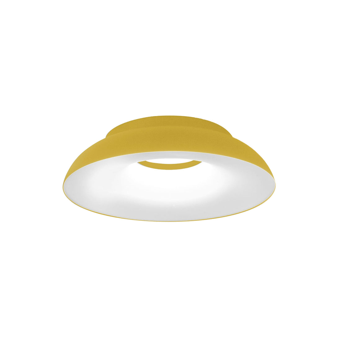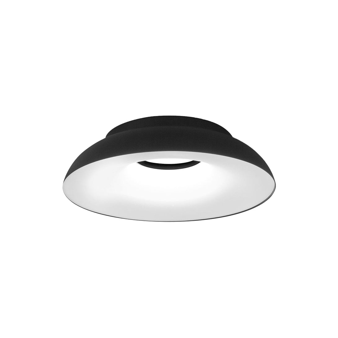 Maggiolone è proposta in due varianti: lampada a sospensione, disponibile in due dimensioni, e lampada da soffitto. Entrambe condividono la stessa essenzialità formale, con struttura in alluminio verniciato e diffusore in metacrilato bianco frost che assicura una luce morbida e uniforme.