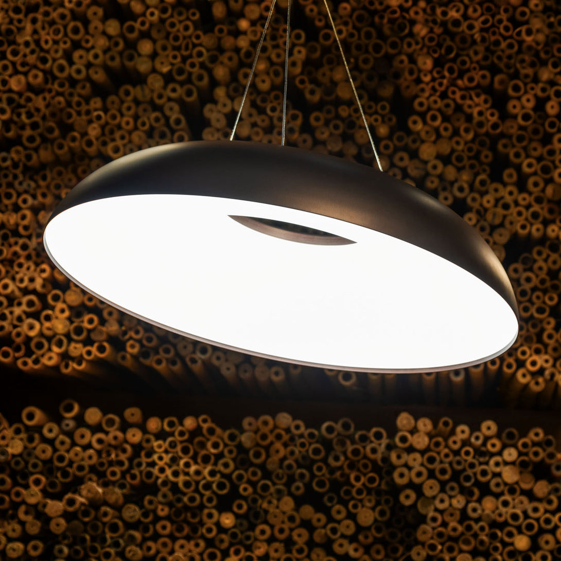 Equipaggiata con sorgente LED integrata e alimentatore elettronico dimmerabile Push/DALI. La lampada Maggiolone è disponibile con temperatura colore di 2700°K e 3000°K e nelle finiture bianco goffrato, nero goffrato, giallo goffrato e bronzo verniciato opaco.