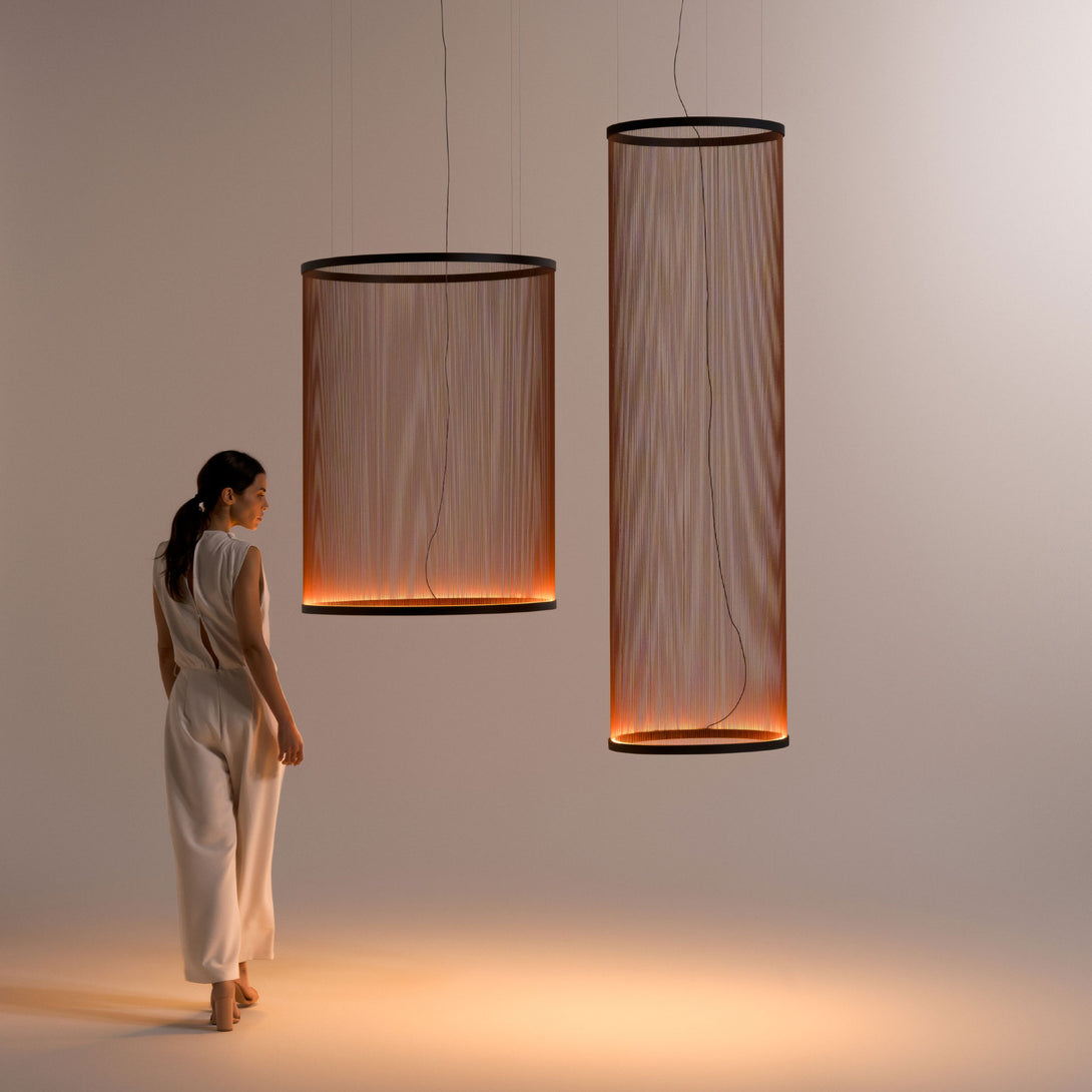 Presentata da Vibia in un'elegante varietà di silhouette coniche e cilindriche, la lampade Array fluttuano, seducenti e brillanti, evocando un senso di raffinatezza apprezzabile in qualsiasi contesto, mentre le dimensioni imponenti non ne limitano affatto l’utilizzo a contesti pubblici e commerciali, mentre i modelli più piccoli, adatti all’uso residenziale, conferiscono un'atmosfera intima e dinamica grazie a un connubio di tensione ed equilibrio.