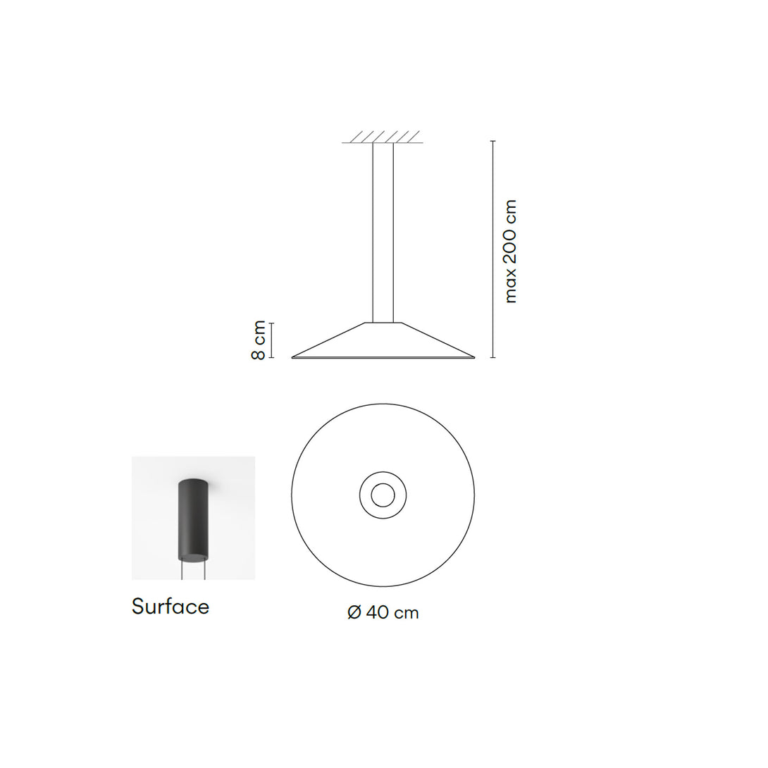 Dimensioni: Ø 40 cm - - H. corpo lampada 8 cm - H.max 200 cm
