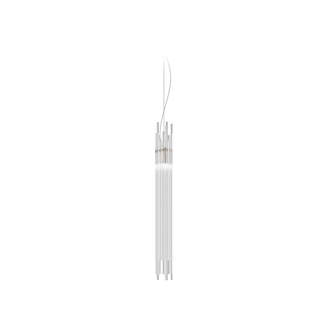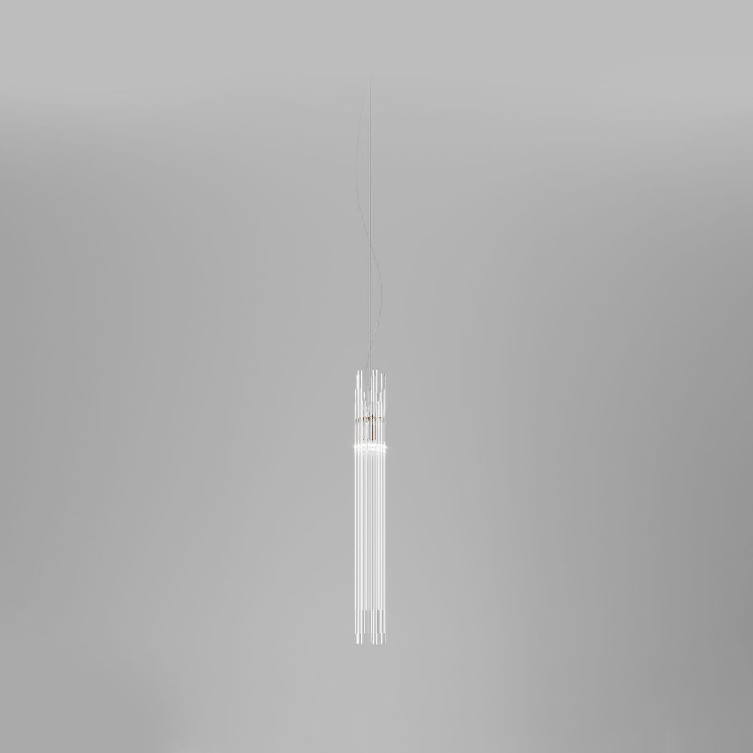 La caratteristica delle lampade Diadema sono le canne di vetro di varie dimensioni che, poggiate su una struttura di bronzo satinato oppure cromo lucido, danno vivacità e movimento al progetto. Il risultato è quello di una luce in movimento: partendo dal singolo elemento Romani Saccani Architetti Associati ha creato un sistema complesso in cui le canne di vetro in cristallo forniscono dinamicità non solo al design ma anche alla luce.